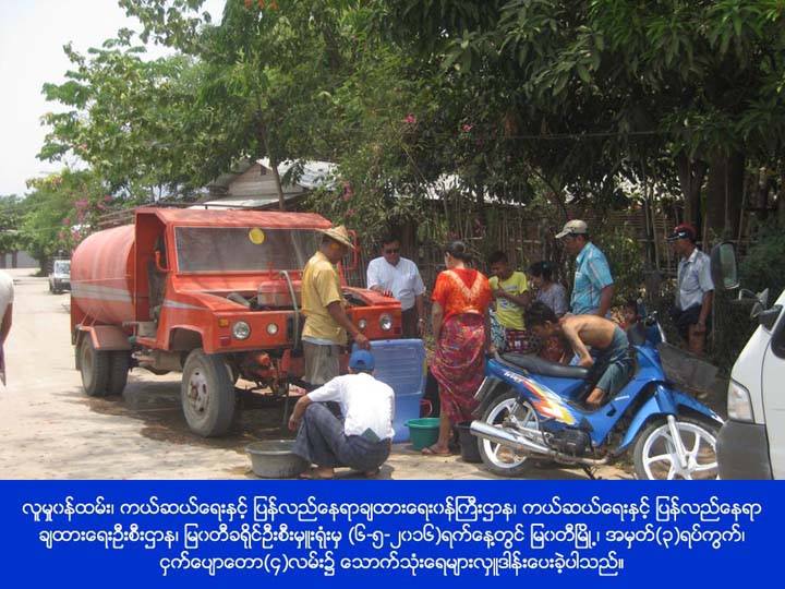 လူမှုဝန်ထမ်း၊ ကယ်ဆယ်ရေးနှင့်ပြန်လည်နေရာချထားရေးဝန်ကြီးဌာန၊ ကယ်ဆယ်ရေးနှင့်ပြန်လည်နေရာချထားရေးဦးစီးဌာန၊ မြဝတီခရိုင်ဦးစီးမှူးရုံးမှ တာဝန်ရှိသူများသည် ကရင်ပြည်နယ်၊ မြဝတီမြို့နယ်၊ အမှတ်(၃)ရပ်ကွက်၊ ငှက်ပျောတော(၂)လမ်း၊ (၄)လမ်း၊ နတ်စင်လမ်း၊ ကျွန်းတော(၂)လမ်းရှိ ပြည်သူများအတွက် ရေဂါလံ (၃၀၀၀) အား (၆-၅-၂၀၁၆) ရက်နေ့တွင် သွားရောက် ဖြန့်ဝေပေးခဲ့ပြီးဖြစ်ကြောင်း သိရှိရပါသည်။