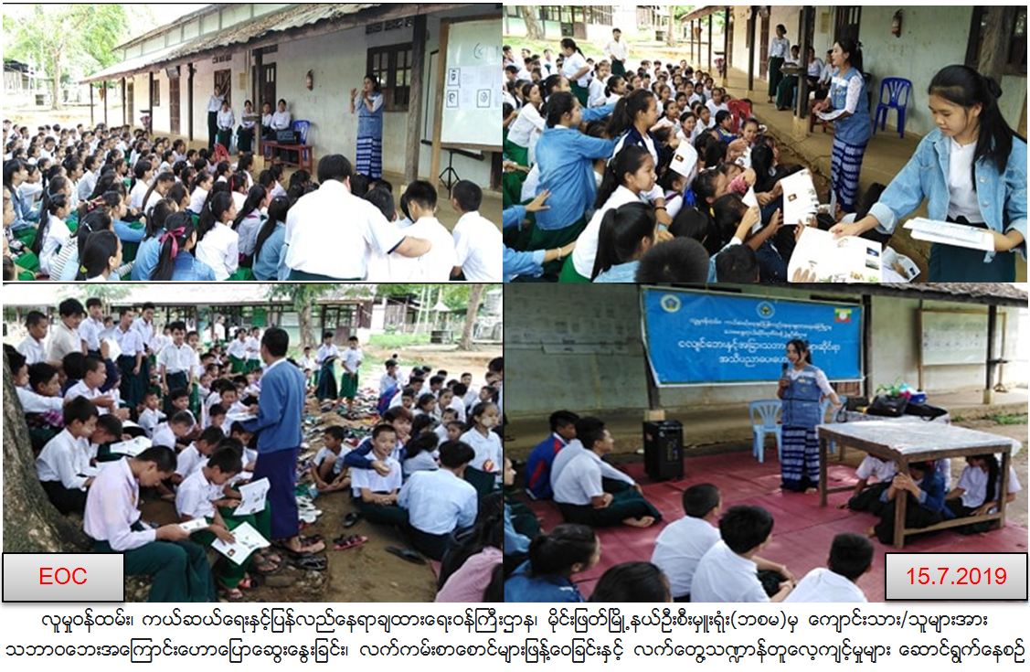 လူမှုဝန်ထမ်း၊ ကယ်ဆယ်ရးနှင့်ပြန်နေရာချထားရေးဝန်ကြီးဌာန၊ ဘေးအန္တရာယ်ဆိုင်ရာစီမံခန့်ခွဲမှုဦးစီးဌာန၊ မိုင်းဖြတ်မြို့နယ်ဦးစီးမှူးရုံးမှ ၁၅.၇.၂၀၁၉ ရက်နေ့ တာလေမြို့၊ အခြေခံပညာအထက်တန်းကျောင်း(ခွဲ)ပါလိုင်ကျောင်းတွင် တက်ရောက်သူကျောင်းသား/သူ (၂၀၀) ဦးအား ငလျင်ဘေး နှင့်အခြားဘေးများအကြောင်း အသိပညာပေးဟောပြောဆွေးနွေးခဲ့ပြီး ဦးစီးဌာန၏ ရည်ရွယ်ချက်များ၊ လုပ်ငန်းတာဝန်များ ၊ ဘေး(၈)မျိုးဆောင်ရန်ရှောင်ရန်များ၊ သဘာဝဘေး Videoများ ပြသခြင်း၊ လက်တွေ့ဆောင်ရွက်စေခြင်း၊ လက်ကမ်းစာစောင်များ ဖြန့်ဝေပေးခြင်း၊ ပညာပေးဗီနိုင်းများ ပေးအပ်ခြင်းများဆောင်ရွက်ခဲ့ကြောင်း သတင်းရရှိပါသည်။