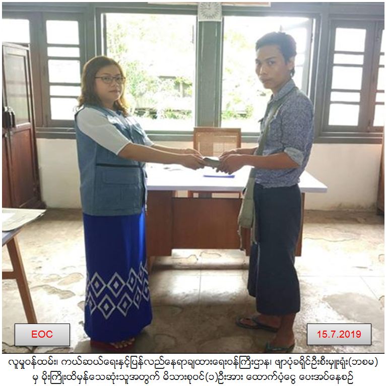 လူမှုဝန်ထမ်း၊ ကယ်ဆယ်ရေးနှင့်ပြန်လည်နေရာချထားရေးဝန်ကြီးဌာန၊ ဘေးအန္တရာယ်ဆိုင်ရာစီမံခန့်ခွဲမှုဦးစီးဌာန၊ ဖျာပုံခရိုင်ဦးစီးမှူးရုံးမှ တာဝန်ရှိသူများသည် ဇူလိုင်လ(၁၅)ရက်နေ့တွင် ဒေးဒရဲမြို့နယ်၊ နမော့ဝကျေးရွာအုပ်စု၊ တမော့ဝရွာမကျေးရွာတွင် မိုးကြိုးဘေးဖြစ်ပွားခဲ့ရာ ဦးဝင်းနိုင်(ဘ)ဦးတုတ်ကြီး၊ အသက်(၄၇)နှစ်သည် ဇူလိုင်လ(၁၂)ရက်နေ့ (၁၆း၃၀)နာရီတွင် လယ်ကွင်းထဲရှိနေစဉ် မိုးကြိုးထိမှန်သေဆုံးခဲ့ခြင်းအတွက် ထောက်ပံ့ငွေ(၃၀၀၀၀ဝိ/-)ကျပ်ကို သေဆုံးသူ၏မိသားစုဝင်တစ်ဦးအား လက်ဝယ်အရောက်သွားရောက် ထောက်ပံ့ပေးခဲ့ကြောင်း သတင်းရရှိပါသည်။