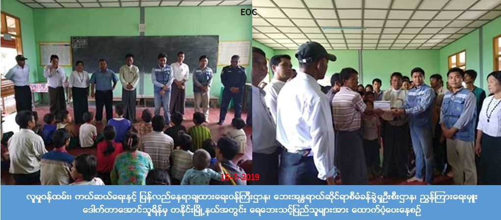 လူမှုဝန်ထမ်း၊ ကယ်ဆယ်ရေးနှင့်ပြန်လည်နေရာချထား ရေးဝန်ကြီးဌာန၊ ဘေးအန္တရာယ်ဆိုင်ရာစီမံခန့်ခွဲမှုဦးစီး ဌာန၊ ညွှန်ကြားရေးမှူး ဒေါက်တာအောင်သူရိန်နှင့်အဖွဲ့သည် ကချင်ပြည်နယ်၊ တနိုင်းမြို့နယ်ရှိ ရေဘေးသင့် ပြည်သူ (၇၈၉) ဦးအား ဆန်ရိက္ခာ (၇) ရက်စာဖိုးငွေ (၁,၆၅၆,၉၀၀) ကျပ်တို့ကို (၁၅-၇-၂၀၁၉) ရက်နေ့တွင် သွားရောက်ထောက်ပံ့ပေးခဲ့ကြောင်း သိရှိရပါသည်။