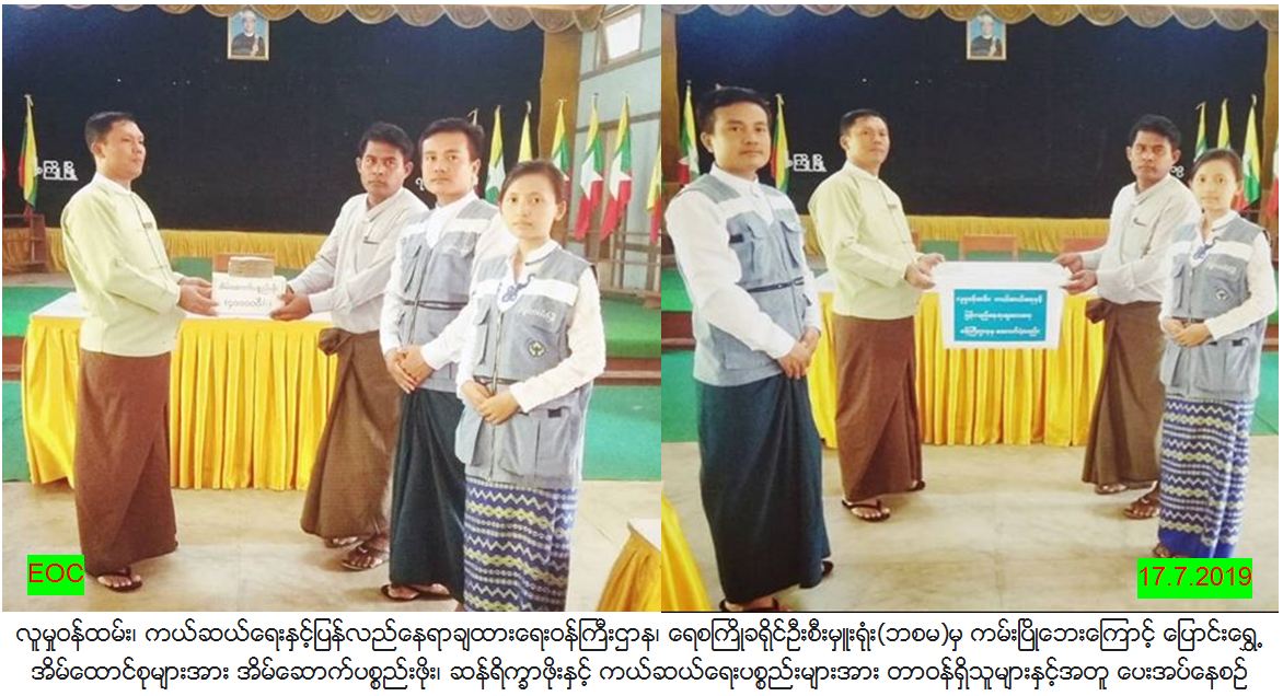လူမှုဝန်ထမ်း၊ ကယ်ဆယ်ရေးနှင့်ပြန်လည်နေရာချထားရေးဝန်ကြီးဌာန၊ ဘေးအန္တရာယ်ဆိုင်ရာစီမံခန့်ခွဲမုှဦးစီးဌာန၊ မကွေးတိုင်းဒေသကြီး၊ ပခုက္ကူခရိုင်၊ ရေစကြိုမြို့နယ်ဦးစီးမှူးရုံးမှ တာဝန်ရှိသူများသည် ရေစကြိုု မြို့နယ်၊ နွယ်နီကျေးရွာအုပ်စု၊ရွာမကျေးရွာနှင့် ကွေ့ထောင့်ကျေးရွာအုပ်စု၊ ကွေ့ထောင့်ကျေးရွာတို့တွင် (၁၇.၇.၂၀၁၉)ရက်နေ့၌ ဧရာဝတီမြစ်ရေတိုက်စား၍ ကမ်းပါးပြိုကျမှုကြောင့် ကြိုတင်ဖျက်သိမ်းပြောင်းရွှေ့လူနေအိမ်(၄) လုံး၊အိမ်ထောင်စု(၅)စု၊စုစုပေါင်းလူဦးရေ(၁၉)ဦးတို့အတွက် ကယ်ဆယ်ရေးပစ္စည်း(၁၀)မျိုး၊ ဆန်ရိက္ခာဖိုး(၇)ရက်စာ(၃၉၉၀ဝိ/-)၊ အိမ်ဆောက်ပစ္စည်းဖိုး (၄၀၀၀၀ဝိ/- )၊ စုစုပေါင်း(၄၃၉၉၀ဝိ/-)ကျပ်အား (၁၇.၇.၂၀၁၉)ရက်နေ့တွင် ရေစကြို မြို့နယ်အထွေထွေအုပ်ချုပ်ရေးမှူ းနှင့်အတူ သက်ဆိုင်ရာကျေးရွာအုပ်ချုပ်ရေးမှူးများ လက်ဝယ်အရောက် ထောက်ပံ့ပေးအပ်ခဲ့ကြောင်း သတင်းရရှိပါသည်။