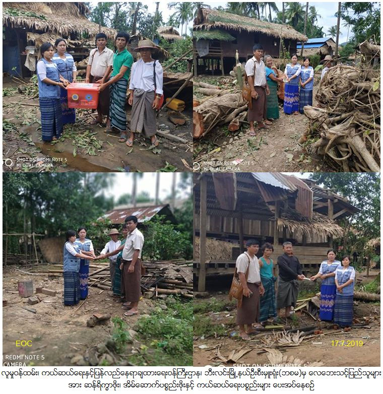 ဝန်ထမ်း၊ ကယ်ဆယ်ရေးနှင့်ပြန်လည်နေရာချထားရေးဝန်ကြီးဌာန၊ ဘေးအန္တရာယ်ဆိုင်ရာစီမံခန့်ခွဲမှုဦးစီးဌာန၊ မွန်ပြည်နယ်၊ သထုံခရိုင်၊ ဘီးလင်းမြို့နယ်ဦးစီးမှူးရုံးမှ တာဝန်ရှိသူများသည် (၁၆.၇.၂၀၁၉)ရက်နေ့တွင် လေပြင်းတိုက်ခတ်မှုကြောင့် ဘီးလင်းမြို့နယ် အဟုံးဝကျေးရွာအုပ်စု၊ ကွင်းကလေးကျေးရွာရှိ လုံးဝပျက်စီးအိမ်ခြေ(၁)လုံး၊ အိမ်ထောင်စု(၁)စုအတွက် ကယ်ဆယ်ရေး ပစ္စည်း(၁၆)မျိုးအိမ်ထောင်စု(၁)စုစာ၊ လူဦးရေကျား(၃)၊ မ(၅)ဦးအတွက် ဆန်ရိက္ခာဖိုးငွေ(၁၆၈၀ဝိ/-)ကျပ်နှင့် အိမ်ဆောက်ပစ္စည်းဖိုးငွေ(၁၀၀၀၀ဝိ/-)ကျပ်၊ တစ်စိတ်တစ်ပိုင်းပျက်စီးအိမ်ခြေ(၉)လုံး၊ အိမ်ထောင်စု(၉)စု၊ လူဦးရေကျား(၃၂)ဦး၊ မ (၃၄)ဦး၊ စုစုပေါင်း(၆၆)ဦးအတွက် ဆန်ရိက္ခာဖိုးငွေ(၁၃၈၆၀ဝိ/-)ကျပ်နှင့် အိမ်ဆောက်ပစ္စည်းငွေ(၉၀၀၀၀ဝိ/-)ကျပ်အား (၁၇.၇.၂၀၁၉)ရက်နေ့(၁၆း၃၀)နာရီ လေဘေးသင့်ပြည်သူများထံ လက်ဝယ်အရောက်ထောက်ပံ့ခဲ့ကြောင်း သတင်းရရှိပါသည်။