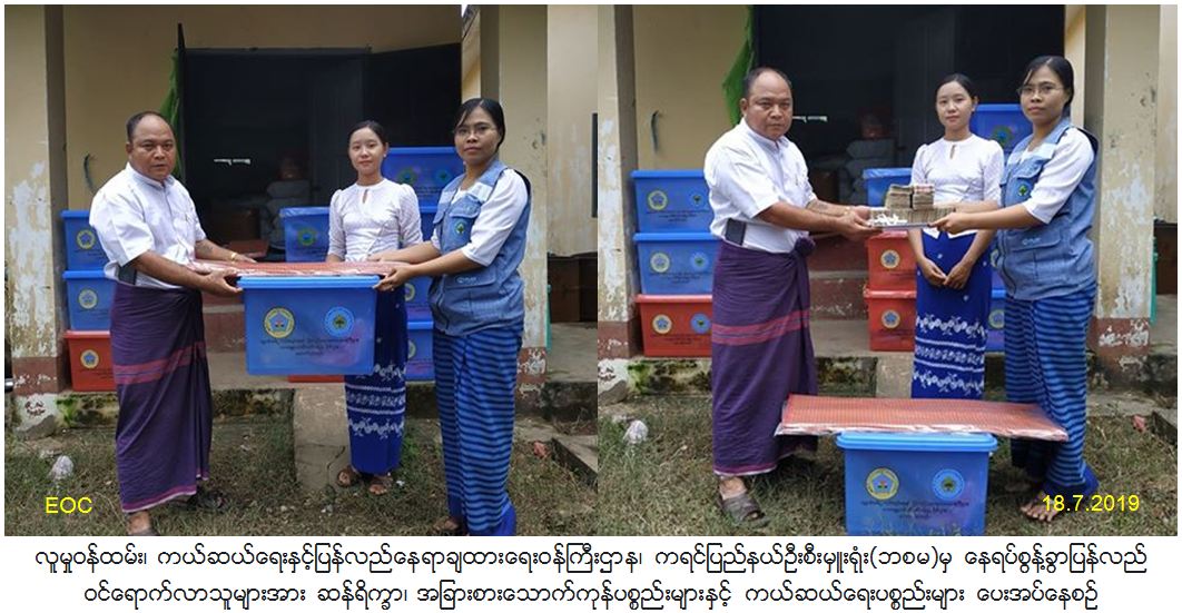 လူမှုဝန်ထမ်း၊ ကယ်ဆယ်ရေးနှင့်ပြန်လည်နေရာချထားရေးဝန်ကြီးဌာန၊ ဘေးအန္တရာယ်ဆိုင်ရာစီမံခန့်ခွဲမှုဦးစီးဌာန၊ ကရင်ပြည်နယ်ဦးစီးမှူးရုံးမှ DKBA(ခွဲထွက်) မိဇိုင်းတောင်ဆရာတော် ဥူးစန္ဒာဝရအဖွဲ့မှ နေရပ်စွန့်ခွာပြန်လည်ဝင်ရောက်လာသူ(အလင်းဝင်ရောက်လာသူ) အိမ်ထောင်စု(၃၆)စု လူဦးရေ(၁၆၅)ဦးတို့အား (၃၇၃၅၃ိ/-)တန်ဖိုးရှိ ကယ်ဆယ်ရေးပစ္စည်း (၁၆)မျိုး အိမ်ထောင်စု(၃၂)စုစာ၊ (၁၃၉၅ဝိ/-)တန်ဖိုးရှိ ကယ်ဆယ်ရေးပစ္စည်း(၅)မျိုး အိမ်ထောင်စု(၄)စုစာ လူတစ်ဦးလျှင် (၄၅၀၀ဝိ/-)တန်ဖိုးရှိ ဆန်ရိက္ခာနှင့် အခြားစားသောက်ကုန်၊ လူဦးရေ(၁၆၅)ဦးအတွက် ထောက်ပံ့ငွေ(၇၄၂၅၀၀ဝိ/-)တို့အား (၁၈-၇-၂၀၁၉)ရက်နေ့တွင် ထောက်ပံ့ပေးအပ်ခဲ့ကြောင်းသတင်းရရှိပါသည်။