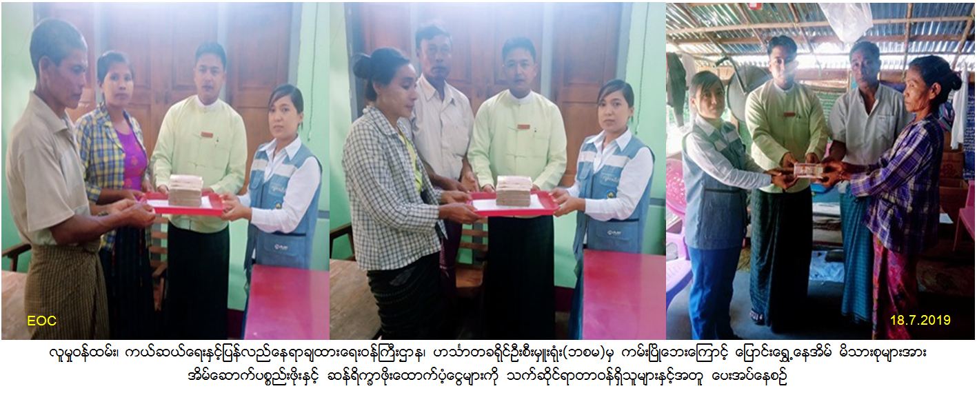 လူမှုဝန်ထမ်း၊ ကယ်ဆယ်ရေးနှင့်ပြန်လည်နေရာချထားရေးဝန်ကြီးဌာန၊ ဘေးအန္တရာယ်ဆိုင်ရာစီမံခန့်ခွဲမှုဦးစီးဋ္ဌာန၊ ဟင်္သာတခရိုင်ဦးစီးမှူးရုံးမှ အင်္ဂပူမြို့နယ်၊ စစ်ကုန်းကျေးရွာအုပ်စု၊ သဒ္ဒမ္မကွျွန်းကျေးရွာ၊ ကျွန်းကြီးကျေးရွာနှင့်နောက်မီးအုပ်စု၊ ကြို့ကုန်းကျေးရွာတို့တွင်(၁၇-၇-၂၀၁၉)နေ့ ကမ်းပြိုဘေးသင့်အိမ်ခြေ(၂၄)လုံး၊ အိမ်ထောင်စု(၂၄)စုရှိ လူဦးရေ(၁၀၈)ဦးတို့အတွက် အိမ်ဆောက်ပစ္စည်းဖိုး(၂၄၀၀၀၀၀)ကျပ်၊ ဆန်ရိက္ခာဖိုး(၂၂၆၈၀၀)ကျပ်၊ စုစုပေါင်းထောက်ပံ့ရန်ပုံငွေ(၂၆၂၆၈၀၀)ကျပ်ကို (၁၂-၇-၂၀၁၉)ရက်နေ့တွင် အထွေထွေအုပ်ချုပ်ရေးဦးစီးဌာနမှ တာဝန်ရှိသူများနှင့်အတူ ဘေးသင့်ပြည်သူများလက်ဝယ်သို့အရောက် ပေးပို့ထောက်ပံပေးအပ်ခဲ့ကြောင်း သတင်းရရှိပါသည်။