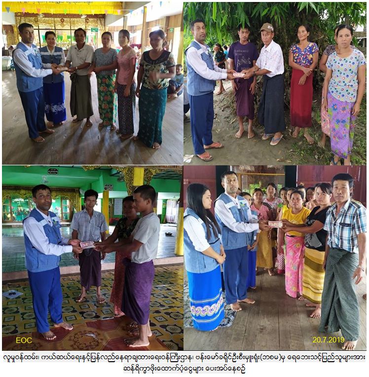 လူမှုဝန်ထမ်း၊ ကယ်ဆယ်ရေးနှင့်ပြန်လည်နေရာချထားရေးဝန်ကြီးဌာန၊ ဘေးအန္တရာယ်ဆိုင်ရာစီမံခန့်ခွဲမှုဦးစီးဌာန၊ဗန်းမော်ခရိုင်ဦးစီးမှူးရုံမှ တာဝန်ရှိသူများသည်(၁၃-၇-၂၀၁၉)ရက်နေ့မှ(၁၆-၇-၂၀၁၉)ရက်နေ့ထိ ဧရာဝတီမြစ်မြစ်ရေမြင့်တက်မှုကြောင့် ကုန်ခါးကျေးရွာ၊ မံပင်ကျေးရွာ၊ ကျွန်းကြီးကျေးရွာ၊ မိုင်ကာကျေးရွာနှင့် မံမလင်းကျေးရွာတို့မှ ရပ်ရွာဘုန်းကြီးကျောင်းနှင့် ဆွေမျိုးနေအိမ်များသို့ရွှေ့ပြောင်းလာသည် အိမ်ထောင်စု (၂၂၀)စု၊ လူဦးရေ(၁၂၁၃)ဦးတို့အတွက် (၇)ရက်စာ ဆန်ဖိုးငွေ(၂၅၄၇၃၀ဝိ/-) တိတိအား (၂၀.၇.၂၀၁၉)နေ့တွင် ဘေးသင့်ကျေးရွာပြည်သူ့ထံသို့အရောက် သွားရောက်ထောက်ပံ့ခဲ့ကြောင်း သတင်းရရှိပါသည်။