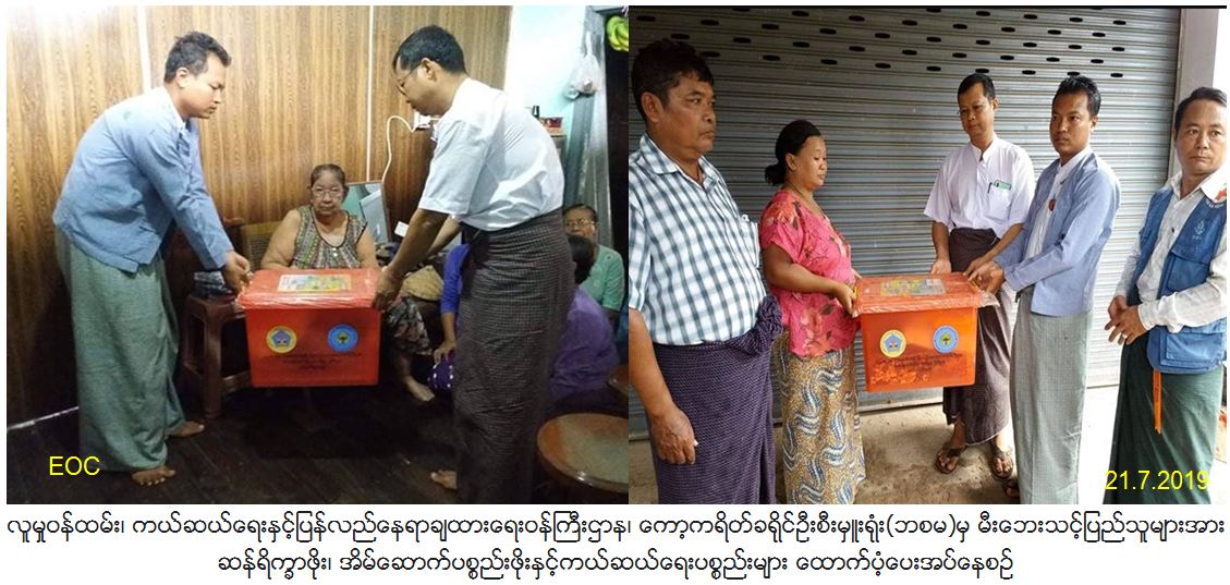 လူမှုဝန်ထမ်း၊ ကယ်ဆယ်ရေးနှင့်ပြန်လည်နေရာချထားရေးဝန်ကြီးဌာန၊ ဘေးအန္တရာယ်ဆိုင်ရာစီမံခန့်ခွဲမှုဦးစီးဌာန၊ ကော့ကရိတ်ခရိုင်ဦးစီးမှူးရုံးမှ (၂၀.၇.၂၀၁၉)ရက်နေ့တွင် ကရင်ပြည်နယ် ကော့ကရိတ်ခရိုင်၊ ကော့ကရိတ်မြို့နယ်၊ အမှတ်(၃)ရပ်ကွက်၊အောင်မင်္ဂလာလမ်းနေ ဦးဇော်မျိုးနိုင်နှင့်ဒေါ်မြသိန်းတို့၏နေအိမ်များ၌ ဖြစ်ပွားခဲ့သောမီးဘေးကြောင့် ဘေးသင့်ခဲ့သည့် အိမ်ခြေ(၂)လုံး အိမ်ထောင်စု(၂)စုမှ လူဦးရေ(၁၃)ဦးအတွက် အိမ်ဆောက်ပစ္စည်းဖိုး (၄၀၀၀၀ဝိ/-)နှင့် လူဦးရေ(၁၃)ဦးအတွက် ဆန်ရိက္ခာ ဖိုးငွေ(၂၇၃၀ဝိ/-)၊ စုစုပေါင်း (၄၂၇၃၀ဝိ/-)၊ ကယ်ဆယ်ရေးပစ္စည်း(၁၅)မျိုးပါပုံး(၂)ပုံးအား (၂၁.၇.၂၀၁၉)ရက်နေ့တွင် အထွေထွေအုပ်ချုပ်ရေးဦးစီးဌာန၊ မြို့နယ်အုပ်ချုပ်ရေးမှူး၊ ရပ်ကွက်အုပ်ချုပ်ရေးမှူး၊ အမျိုးသမီးရေးရာအဖွဲ့မှ တာဝန်ရှိသူများနှင့်အတူပူးပေါင်း၍ ဘေးသင့်ပြည်သူများအား ထောက်ပံ့ပေးခဲ့ကြောင်း သတင်းရရှိပါသည်။
