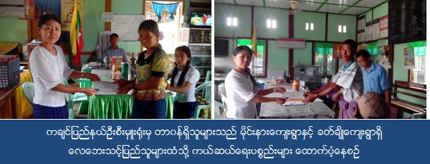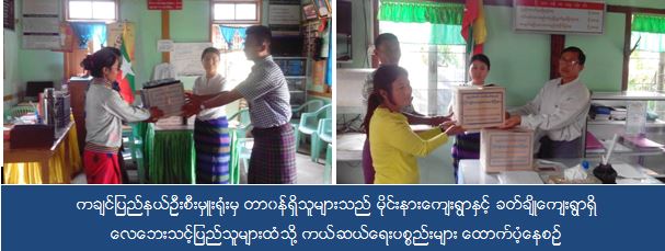 ကချင်ပြည်နယ်၊ ဝိုင်းမော်မြို့နယ်၊ မိုင်းနားကျေးရွာနှင့် ခတ်ချိုကျေးရွာတို့တွင် (၂၉-၃-၂၀၁၆)ရက်နေ့ ဖြစ်ပွားခဲ့သော လေဘေးကြောင့် ဘေးသင့်အိမ်ခြေ (၃၈) လုံး၊ အိမ်ထောင်စု (၃၈) စု၊ လူဦးရေ (၂၂၉) ဦးတို့အတွက် ကယ်ဆယ်ရေးပစ္စည်း(၄)မျိုး (၃၈)အိမ်ထောင်စုစာအား (၈-၄-၂၀၁၆)ရက်နေ့တွင် လည်းကောင်း၊ ဆန်ရိက္ခာ (၃) ရက်စာဖိုး (၂၀၆,၁၀၀ိ/-) နှင့် အိမ်ဆောက်ပစ္စည်းဖိုး (၁,၉၀၀,၀၀၀ိ/-) ဘုရားကျောင်း (၁) လုံးအတွက် (၆၀,၀၀၀ိ/-) စုစုပေါင်း (၂,၁၆၆,၁၀၀ိ/-) အား (၈-၅-၂၀၁၆)ရက်နေ့တွင်လည်းကောင်း သွားရောက်ထောက်ပံ့ခဲ့ပါကြောင်း သိရှိရပါသည်။