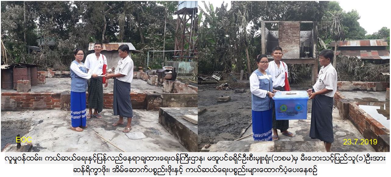 လူမှုဝန်ထမ်း၊ ကယ်ဆယ်ရေးနှင့် ပြန်လည်နေရာချထားရေးဝန်ကြီးဌာန၊ ဘေးအန္တရာယ်ဆိုင်ရာစီမံခန့်ခွဲမှုဦးစီးဌာန၊ မအူပင်ခရိုင်ဦးစီးမှူးရုံးမှ တာဝန်ရှိသူများသည် မအူပင်ခရိုင်၊ ဓနုဖြူမြို့နယ်၊ ရေလဲကျေးရွာအုပ်စု၊ ရေလဲကျေးရွာ၌ (၂၃-၇-၂၀၁၉)ရက်နေ့၌ ဖြစ်ပွားသော မီးဘေးကြောင့် နေအိမ် (၁)လုံး အိမ်ထောင်စု (၁)စုမှ လူဦးရေ (၅)ဦးအတွက် အိမ်ဆောက်ပစ္စည်းဖိုး (၂၀၀ဝဝဝိ/-)၊ ဆန်ရိက္ခာ(၇)ရက်စာ ရန်ပုံငွေ (၁၀၅၀၀ိ/-)၊ စုစုပေါင်းရန်ပုံငွေ (၂၁၀၅၀ဝိ/-)နှင့် ကယ်ဆယ်ရေးပစ္စည်း(၁၆)မျိုးပါ (၁) ပုံးတို့အား (၂၃-၇-၂၀၁၉) ရက်နေ့ (၁၄း၃၀)နာရီအချိန်တွင် ကျေးရွာအုပ်ချုပ်ရေးမှူး၊ ရပ်မိရပ်ဖများ၏ ရှေ့မှောက်တွင် ဘေးသင့်ပြည်သူများ လက်ဝယ်အရောက် ထောက်ပံ့ပေးအပ်ခဲ့ကြောင်း သတင်းရရှိပါသည်။