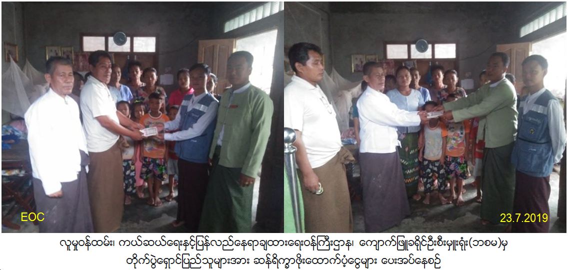 လူမှုဝန်ထမ်း၊ ကယ်ဆယ်ရေးနှင့်ပြန်လည်နေရာချထားရေးဝန်ကြီးဌာန၊ ဘေးအန္တရာယ်ဆိုင်ရာစီမံခန့်ခွဲမှုဦးစီးဌာန၊ ကျောက်ဖြူခရိုင်ဦးစီးမှူးရုံးမှ (21.7.2019)ရက်နေ့တွင် အမ်းမြို့နယ်၊ ရူးကျေးရွာအုပ်စု၊ ဒုက္ကံကျေးရွာမှ ကျောက်ဖြူ မြို့သို့ရောက်ရှိလာသော တိုက်ပွဲရှောင်ပြည်သူ အိမ်ထောင်စု(29)စုမှ လူဦးရေ ကျား (22)ဦး၊ မ (50)ဦး၊ စုစုပေါင်း (72)ဦးတို့တွက် ဆန်ရိက္ခာ(1)လစာဖို်း 1 ဦးလျှင် (9000)ကျပ် နှုန်းဖြင့် (648000)ကျပ်အား ကျောက်ဖြူခရိုင်အထွေထွေအုပ်ချုပ်ရေးဦးစီးဌာနမှ တာဝန်ရှိသူများနှင့်အတူ (23.7.2019)ရက်နေ့တွင် ၄င်းတို့၏ ဆွေမျိုးများနေအိမ်၌ တိုက်ပွဲရှောင်ပြည်သူများလက်ဝယ်အရောက် ထောက်ပံ့ပေးခဲ့ကြောင်း သတင်းရရှိပါသည်။