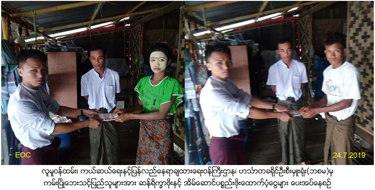 လူမှုဝန်ထမ်း၊ ကယ်ဆယ်ရေးနှင့်ပြန်လည်နေရာချထားရေးဝန်ကြီးဌာန၊ ဘေးအန္တရာယ်ဆိုင်ရာစီမံခန့်ခွဲမှုဦးစီးဋ္ဌာန၊ ဟင်္သာတခရိုင်ဦးစီးမှူးရုံးမှ လေးမျက်နှာမြို့နယ်၊ ယင်းဆယ်ကျေးရွာအုပ်စု ၊ ယင်းဆယ်ကျေးရွာတွင်(၂၃-၇-၂၀၁၉)နေ့ ကမ်းပြိုဘေးသင့် အိမ်ခြေ(၃)လုံး၊ ၄င်းအိမ်ထောင်စု(၃)စုရှိ လူဦးရေ(၁၇)ဦးတို့အတွက် အိမ်ဆောက်ပစ္စည်းဖိုး (၃၀၀၀၀ဝိ/)ကျပ်၊ ဆန်ရိက္ခာဖိုး(၃၅၇၀ဝိ)ကျပ်၊ စုစုပေါင်းထောက်ပံ့ရန်ပုံငွေ (၃၃၅၇၀ဝိ/)ကျပ်အား (၂၄-၇- ၂၀၁၉) ရက်နေ့တွင် လေးမျက်နှာမြို့နယ်အထွေထွေအုပ်ချုပ်ရေးဦးစီးဋ္ဌာနမှတာဝန်ရှိသူများနှင့်အတူ ဘေးသင့်ပြည်သူများလက်ဝယ်အရောက် ထောက်ပ့ံပေးအပ်ခဲ့ကြောင်း သတင်းရရှိပါသည်။