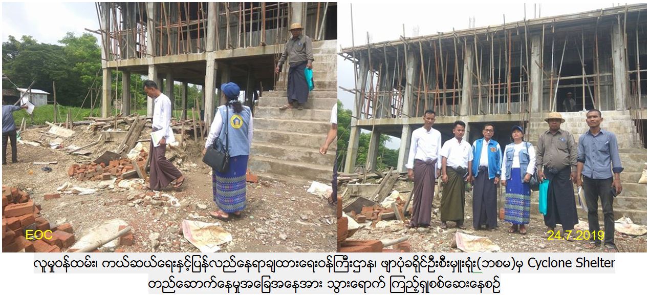 လူမှုဝန်ထမ်း၊ ကယ်ဆယ်ရေးနှင့်ပြန်လည်နေရာချထားရေးဝန်ကြီးဌာန၊ ဖျာပုံခရိုင်ဦးစီးမှူးရုံးမှ တာဝန်ရှိသုများသည် ဇူလိုင်လ(၂၄)ရက်နေ့တွင် ဘိုကလေးမြို့နယ်၊ မဂူကျေးရွာအုပ်စု၊ မြစ်ပိုးကျုံစိန်ကျေးရွာတွင် အမျိုးသားသဘာဝဘေးအန္တရာယ်ဆိုင်ရာစီမံခန့်ခွဲမှု ရန်ပုံငွေဖြင့် တည်ဆောက်နေသည့် Multi purpose shelter ၏ ရ၅% ပြီးစီးနေမှုအခြေအနေအား ဘိုကလေးမြို့နယ် shelter တည်ဆောက်ရေးလုပ်ငန်းကြပ်ကြပ်မှု ကော်မတီအဖွဲ့နှင့် အတူကွင်းဆင်းသွားရောက်ကြည့်ရှုခဲ့ကြောင်း သတင်းရရှိပါသည်။