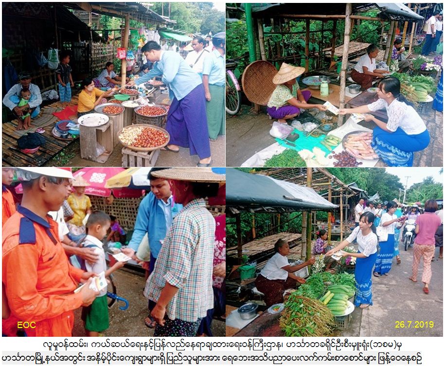လူမှုဝန်ထမ်း၊ ကယ်ဆယ်ရေးနှင့်ပြန်လည်နေရာချထားရေးဝန်ကြီးဌာန၊ ဘေးအန္တရာယ်ဆိုင်ရာစီမံခန့်ခွဲမှုဦးစီးဌာန၊ ဟင်္သာတခရိုင်ဦးစီးမှူးရုံးမှ တာဝန်ရှိသူများသည် (၂၆.၇.၂၀၁၉) ရက်နေ့ နံနက်(၀၈း၀၀)နာရီအချိန်တွင် ဟင်္သာတမြို့နယ်အတွင်း အနိမ့်ပိုင်းကျေးရွာများရှိ ပြည်သူများအား ရေဘေးအသိပညာပေးလက်ကမ်းစာစောင်များ ဖြန့်ဝေခြင်းကို မြန်မာနိုင်ငံမီးသတ်တပ်ဖွဲ့၊ မြန်မာနိုင်ငံကြက်ခြေနီအသင်း၊ ဟင်္သာတခရိုင်လူမှုကွန်ရက်၊ ရပ်ကွက်အုပ်ချုပ်ရေးမှူးများနှင့်အတူပူးပေါင်း၍ ဖြန့်ဝေခဲ့ကြောင်း သတင်းရရှိပါသည်။