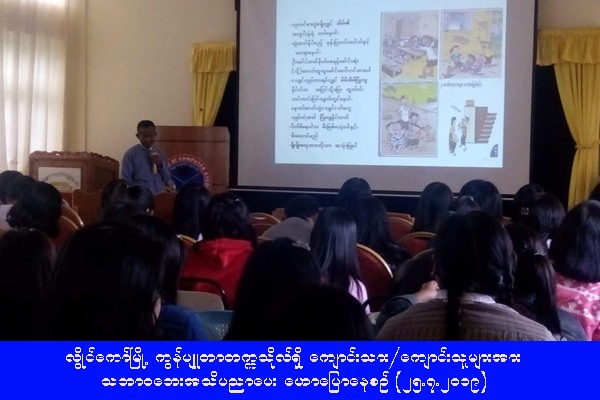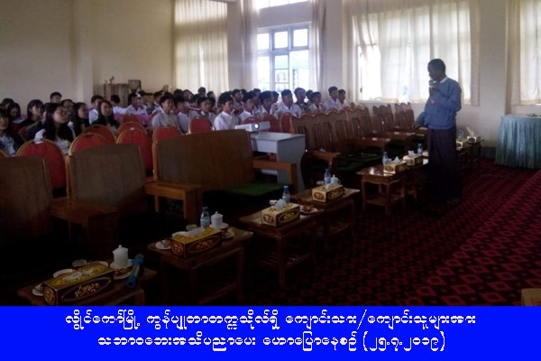 လူမှုဝန်ထမ်း၊ ကယ်ဆယ်ရေးနှင့်ပြန်လည်နေရာချထားရေးဝန်ကြီးဌာန၊ ဘေးအန္တရာယ်ဆိုင်ရာဦးစီးဌာန၊ ကယားပြည်နယ်ဦးစီးမှူးရုံးမှ (၂၅.၇.၂၀၁၉) ရက်နေ့ လွိုင်ကော်ခရိုင်၊ လွိုင်ကော်မြို့၊ ကွန်ပျူတာတက္ကသိုလ်ရှိ ကျောင်းသား/သူ(၁၅၀)ဦးအား သဘာဝဘေးအန္တရာယ်ဆိုင်ရာ အသိပညာပေးဟောပြောပွဲပြုလုပ်ခဲ့ဲပြီး လက်ကမ်းစာစောင်များဖြန့်ဝေခဲ့ကြောင်း သတင်းရရှိပါသည်။