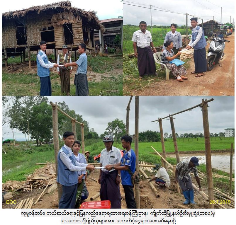 လူမှုဝန်ထမ်း၊ ကယ်ဆယ်ရေးနှင့်ပြန်လည်နေရာချထားရေးဝန်ကြီးဌာန၊ ဘေးအန္တရာယ်ဆိုင်ရာစီမံခန့်ခွဲမှုဦးစီးဌာန၊ မွန်ပြည်နယ်၊ သထုံခရိုင်၊ ကျိုက်ထိုမြို့နယ်ဦးစီးမှူးရုံးမှ တာဝန်ရှိသူများသည် ကျိုက်ထိုမြို့နယ်၊ ကော့စံနိုင်ရပ်ကွက်နှင့် ကင်မွန်းချောင်းကျေးရွာတို့တွင် (၂၅-၇-၂၀၁၉) ရက်နေ့၌ ဖြစ်ပွားခဲ့သော မိုးသည်းထန်စွာရွာသွန်းပြီး လေပြင်းတိုက်ခတ်မှုကြောင့် ဘေးသင့်ပြိုကျနေအိမ် (၁) လုံးအတွက် ကယ်ဆယ်ရေးပစ္စည်း (၁၁)မျိုး (၁) အိမ်ထောင်စာ၊ အိမ်ဆောက်ပစ္စည်းဖိုးငွေ (၃၀၀၀ဝိ/-)၊ တစ်စိတ်တစိပိုင်းနေအိမ်(၁)လုံးအတွက် အိမ်ဆောက်ပစ္စည်းဖိုးငွေ (၅၀၀၀ဝိ/-) ကျပ်နှင့် ထိုခိုက်ဒဏ်ရာရသူ (၁)ဦးအတွက် ထောက်ပံ့ငွေ (၅၀၀၀ဝိ/-)၊ လူဦးရေ (၈) ဦးအတွက် ဆန်ရိက္ခာဖိုးငွေ (၇) ရက်စာ (၁၆၈၀ဝိ/-)ကျပ်၊ စုစုပေါင်းထောက်ပံ့ငွေ (၁၄၆၈၀ဝိ/-) တို့အား (၂၇-၇-၂၀၁၉) ရက်နေ့ ကော့စံနိုင်ရပ်ကွက်နှင့် ကင်မွန်းချောင်းကျေးရွာတို့တွင် မြို့နယ်သဘာဝဘေးကော်မတီအဖွဲ့ဝင်များနှင့်အတူ ဘေးသင့်ပြည်သူများအား ထောက်ပံ့ပေးအပ်ခဲ့ကြောင်း သတင်းရရှိပါသည်။