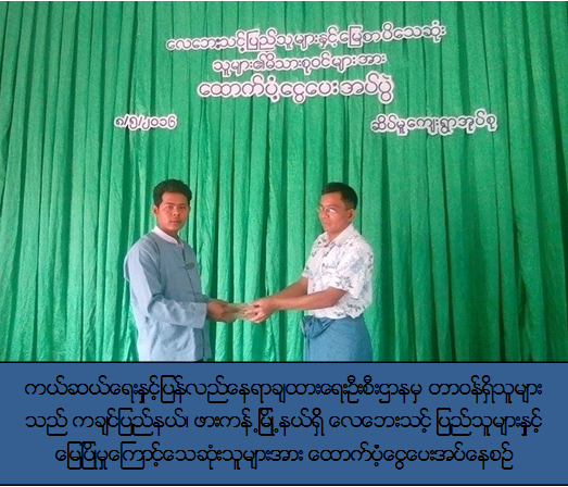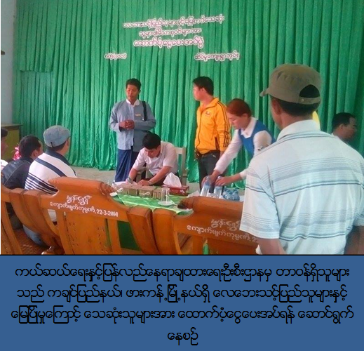 ကယ်ဆယ်ရေးနှင့် ပြန်လည်နေရာချ ထားရေးဦးစီးဌာန၊ ကချင်ပြည်နယ် ဦးစီးမှူးရုံးမှ တာဝန်ရှိ သူများသည် (၈-၅-၂၀၁၆) ရက်နေ့တွင် ကချင် ပြည် နယ်၊ မိုးညှင်းခရိုင်၊ ဖားကန့်မြို့နယ် အတွင်းရှိ ဆိတ်မူကျေးရွာအုပ်စုမှ ကျေးရွာ(၆)ရွာရှိ အမိုးလန် ပျက်စီး နေအိမ် (၃၀၉) အိမ်ထောင်စုအတွက် တစ်အိမ်ထောင်လျှင် (၂၀၀၀၀)ကျပ်ဖြင့် စုစုပေါင်း ထောက်ပံ့ငွေ (၆၁၈၀၀၀၀) ကျပ် နှင့် (၅-၅-၂၀၁၆) နေ့တွင် ဖြစ်ပွား သောမြေပြိုဘေးကြောင့် သေဆုံးသူ (၁၃)ဦး တို့အတွက် (၁)ဦးလျှင် (၁၀၀၀၀၀)ကျပ် နှုန်းဖြင့် (၁၃၀၀၀၀၀) ကျပ်အား ကျေးရွာအုပ်ချုပ်ရေးမှူး ရုံးတွင် လေဘေးသင့် ပြည်သူများနှင့် သေဆုံးသူများ၏ မိသားစုဝင်များသို့ သွားရောက် ထောက်ပံ့ခဲ့ပါကြောင်း သိရှိရပါသည်။