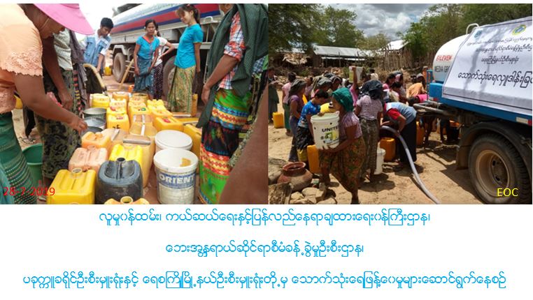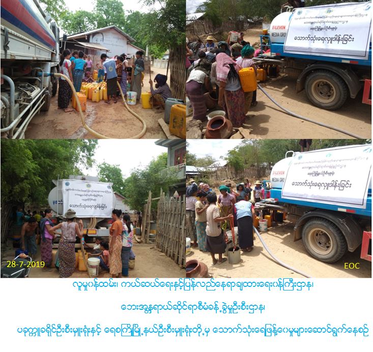 လူမှုဝန်ထမ်း၊ ကယ်ဆယ်ရေးနှင့်ပြန်လည်နေရာချထားရေးဝန်ကြီးဌာန၊ ဘေးအန္တရာယ်ဆိုင်ရာစီမံခန့်ခွဲမှုဦးစီးဌာန၊ ပခုက္ကူခရိုင်ဦးစီးမှူးရုံးနှင့် ရေစကြိုမြို့နယ်ဦးစီးမှူးရုံးတို့မှ တာဝန်ရှိသူများသည် (၂၈-၇-၂၀၁၉)ရက်နေ့တွင် သောက်သုံးရေအခက်အခဲဖြစ်ပေါ်နေသော ရေစကြိုမြို့နယ်၊ ထန်းငယ်တောကျေးရွာအုပ်စု၊ ကျောက်ထပ်ကျေးရွာနေပြည်သူအိမ်ထောင်စု(၂၁၀)အတွက် သောက်သုံးရေဂါလံ(၂၈၀၀)ကိုလည်းကောင်း၊ ထန်းတိုကျေးရွာအုပ်စု၊ မြစ်လှချောင်ကျေးရွာကျေးရွာနေပြည်သူအိမ်ထောင်စု (၁၀၉)အတွက် သောက်သုံးရေဂါလံ(၂၈၀၀)ကိုလည်းကောင်း စုစုပေါင်းသောက်သုံးရေဂါလံ(၅၆၀၀)ကိုEleven Media Group ရေအလှူယာဉ်ဖြင့် ဆရာတော် ဦးသောဘဏ၊ကျေးရွာအုပ်စုအုပ်ချုပ်ရေးမှူးတို့နှင့်အတူကျေးရွာများသို့သွားရောက်ဖြန့်ဝေခဲ့ပါကြောင်း သတင်းရရှိပါသည်။