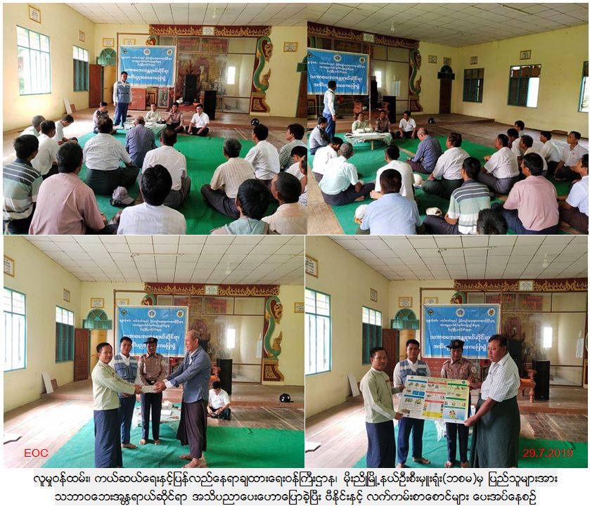 လူမှုဝန်ထမ်း၊ ကယ်ဆယ်ရေးနှင့်ပြန်လည်နေရာချထားရေးဝန်ကြီးဌာန၊ ဘေးအန္တရာယ်ဆိုင်ရာစီမံခန့်ခွဲမှုဦးစီးဌာန၊ မိုးညိုမြို့နယ်ဦးစီးမှူးရုံးမှ တာဝန်ရှိသူများသည် (၂၉-၇-၂၀၁၉)ရက်နေ့ (၀၉း၃၀)နာရီအချိန်တွင် နတ်တလင်းမြို့နယ်၊ တာပွန်မြို့ ဗောဓိ မာရ်အောင် ငါးထပ်ဘုရားကြီး ဓမ္မာရုံတွင် သဘာဝဘေးအန္တရာယ်ဆိုင်ရာအသိပညာပေးဟောပြောမှုများကို ကျင်းပဆောင်ရွက်ခဲ့ရာ ဟောပြောပွဲသို့ ဌာနဆိုင်ရာများ၊ ကျေးရွာအုပ်ချုပ်ရေးမှူးများနှင့်ပြည်သူများ (၈၀)ဦးခန့်တက်ရောက်ခဲ့၍ ထိုတက်ရောက်လာသူများအား လက်ကမ်းစာစောင်များနှင့် ပိုစတာများဖြန့်ဝေခဲ့ကြောင်း သတင်းရရှိပါသည်။