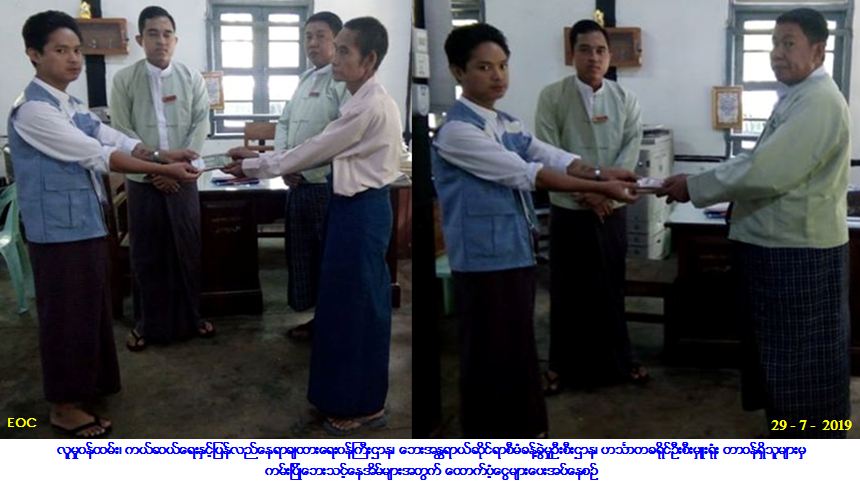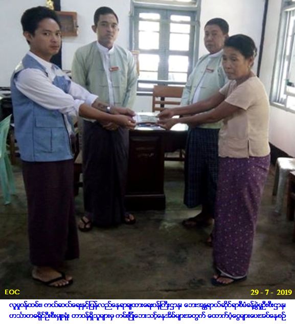 လူမှုဝန်ထမ်း၊ ကယ်ဆယ်ရေးနှင့်ပြန်လည်နေရာချထားရေးဝန်ကြီးဌာန၊ ဘေးအန္တရာယ်ဆိုင်ရာစီမံခန့်ခွဲမှုဦးစီးဌာန၊ ဟင်္သာတခရိုင်ဦးစီးမှူးရုံးမှ တာဝန်ရှိသူများသည် မြန်အောင်မြို့နယ်၊ အမှတ် (၁) ရပ်ကွက်၊ မကျီးစုတာ၌ (၂၅-၇-၂၀၁၉) ရက်နေ့တွင် ဖြစ်ပွားခဲ့သော ကမ်းပြိုဘေးကြောင့် ဘေးသင့်အိမ်ခြေ (၁) လုံး၊ အိမ်ထောင်စု (၁) စုအတွက် အိမ်ဆောက်ပစ္စည်းဖိုး (၁၀၀,၀၀၀/-) ကျပ်၊ လူဦးရေ (၆) ဦးတို့အတွက် ဆန်ရိက္ခာဖိုးငွေ (၁၂,၆၀၀/-) ကျပ်အား လည်းကောင်း၊ မြန်အောင်မြို့နယ်၊ ရွှေကျင်အုပ်စု၊ ဘုရားလှကျေးရွာ၌ (၂၆-၇-၂၀၁၉) ရက်နေ့တွင် ဖြစ်ပွားခဲ့သော ကမ်းပြိုဘေးကြောင့် ဘေးသင့်အိမ်ခြေ (၁) လုံး၊ အိမ်ထောင်စု (၁) စုအတွက် အိမ်ဆောက်ပစ္စည်းဖိုးငွေ (၁၀၀,၀၀၀/-) ကျပ်၊ လူဦးရေ (၄) ဦးတို့အတွက် ဆန်ရိက္ခာဖိုးငွေ (၈,၄၀၀/-) ကျပ်တို့အားလည်းကောင်း၊ မြန်အောင်မြို့နယ်၊ ဘန့်ဘွေးကုန်းအုပ်စု၊ မိချောင်းအိုင်ကျေးရွာ၌ (၂၈-၇-၂၀၁၉) ရက်နေ့တွင် ဖြစ်ပွားခဲ့သော ကမ်းပြိုဘေးကြောင့် ဘေးသင့် အိမ်ခြေ (၁) လုံး၊ အိမ်ထောင်စု (၁) စုအတွက် အိမ်ဆောက်ပစ္စည်းဖိုးငွေ (၁၀၀,၀၀၀/-) ကျပ်၊ လူဦးရေ (၃) ဦးတို့အတွက် ဆန်ရိက္ခာဖိုးငွေ (၆,၃၀၀/-) ကျပ်တို့အားလည်းကောင်း (၂၉-၇-၂၀၁၉) ရက်နေ့တွင် မြန်အောင်မြို့နယ်၊ အထွေထွေအုပ်ချုပ်ရေးဦးစီးဌာန၌ မြို့နယ်အုပ်ချုပ်ရေးမှူးနှင့်အတူ ဘေးသင့်ပြည်သူများထံသို့ အသီးသီးထောက်ပံ့ပေးအပ်ခဲ့ကြောင်း သတင်းရရှိပါသည်။