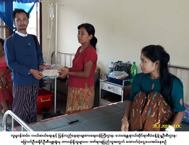 လူမှုဝန်ထမ်း၊ ကယ်ဆယ်ရေးနှင့် ပြန်လည်နေရာချထားရေးဝန်ကြီးဌာန၊ ဘေးအန္တရာယ်ဆိုင်ရာစီမံခန့်ခွဲမှု ဦးစီးဌာန၊ မြောက်ဦးခရိုင်ဦးစီးမှူးရုံးမှ တာဝန်ရှိသူများသည် ကျောက်တော်မြို့နယ်၊ ကျားနင်းကန်ကျေးရွာ အုပ်စု၊ လိပ်မကျေးရွာ၌ (၃၀-၇-၂၀၁၉) ရက်နေ့တွင်ဖြစ်ပွားခဲ့သော လက်နက်ကျည်ထိမှန်မှုကြောင့် ယာတင်ပါး ဖောက်ဝင်ဒဏ်ရာ တစ်ချက်ရရှိခဲ့ပြီး ကျောက်တော်ပြည်သူ့ဆေးရုံ၌ ဆေးကုသမှုခံယူလျက်ရှိသည့် ဘေးသင့် ပြည်သူ (၁) ဦးအတွက် ဒဏ်ရာရထောက်ပံ့ငွေ (၅၀,၀၀၀/-) ကျပ်ကို ဘေးသင့်ပြည်သူထံသို့ (၃၁-၇-၂၀၁၉) ရက်နေ့တွင် သွားရောက်ထောက်ပံ့ခဲ့ပါကြောင်း သတင်းရရှိပါသည်။