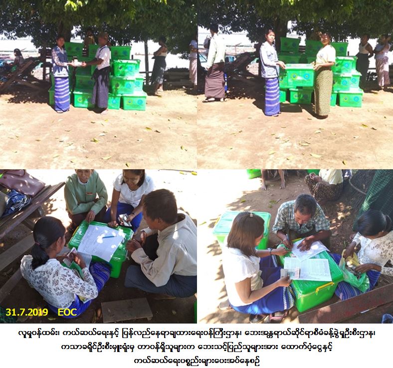 လူမှုဝန်ထမ်း၊ ကယ်ဆယ်ရေးနှင့် ပြန်လည်နေရာချထားရေးဝန်ကြီးဌာန၊ ဘေးအန္တရာယ်ဆိုင်ရာစီမံခန့်ခွဲမှုဦးစီး ဌာန၊ ကသာခရိုင်ဦးစီးမှူးရုံးမှ တာဝန်ရှိသူများသည် ကသာမြို့နယ်၊ ပုလွေရွှေကျေးရွာအုပ်စု၊ ရေလည်ကျွန်းကျေးရွာ၌ (၁၂-၇-၂၀၁၉) ရက်နေ့မှ (၂၁-၇-၂၀၁၉) ရက်နေ့အတွင်း ဖြစ်ပွားခဲ့သော ဧရာဝတီမြစ်ရေတိုက်စားမှုကြောင့် ရေဝင်မျောပါ အိမ်ထောင်စု (၆) စုမှ လူဦးရေ (၃၃) ဦးအတွက် ကယ်ဆယ်ရေးပစ္စည်း (၁၀) မျိုး (၆) အိမ်ထောင်စုစာ၊ ဆန်ရိက္ခာဖိုးနှင့်အိမ်ဆောက်ပစ္စည်းဖိုးထောက်ပံ့ငွေ (၆၆၉,၃၀၀/-) ကျပ်တို့အားလည်းကောင်း၊ (၃၀-၇-၂၀၁၉) ရက်နေ့တွင် ကမ်းပြိုပြောင်းရွှေ့အိမ်ထောင်စု (၃၀) စုမှ လူဦးရေ (၁၆၉) ဦးတို့အတွက် ကယ်ဆယ်ရေးပစ္စည်း (၁၀) မျိုး (၃၀) အိမ်ထောင်စုစာ၊ ဆန်ရိက္ခာဖိုးနှင့် အိမ်ဆောက်ပစ္စည်းဖိုးထာက်ပံ့ငွေ (၃,၃၅၄,၉၀၀/-) ကျပ်တို့အားလည်းကောင်း (၃၁-၇-၂၀၁၉) ရက်နေ့တွင် ဒုတိယမြို့နယ်အုပ်ချုပ်ရေးမှူးနှင့်အတူ ဘေးသင့်ပြည်သူများထံသို့ သွားရောက်ထောက်ပံ့ခဲ့ပါကြောင်း သတင်း ရရှိပါသည်။