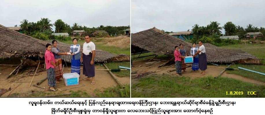 လူမှုဝန်ထမ်း၊ ကယ်ဆယ်ရေးနှင့် ပြန်လည်နေရာချထားရေးဝန်ကြီးဌာန၊ ဘေးအန္တရာယ်ဆိုင်ရာစီမံခန့်ခွဲမှုဦးစီး ဌာန၊ မြိတ်ခရိုင်ဦးစီးမှူးရုံးမှ တာဝန်ရှိသူများသည် တနင်္သာရီမြို့နယ်၊ တကူကျေးရွာအုပ်စု၊ အင်ရှည်ကုန်း ကျေးရွာ၌ (၃၁-၇-၂၀၁၉) ရက်နေ့တွင် ဖြစ်ပွားခဲ့သော လေပြင်းတိုက်ခတ်မှုကြောင့် ပြိုလဲနေအိမ် (၁) လုံးမှ လူဦးရေ (၇) ဦးဘေးသင့်ခဲ့ရာ အဆိုပါဘေးသင့်ပြည်သူများအတွက် ကယ်ဆယ်ရေးပစ္စည်း (၁၅) မျိုး (၁) အိမ်ထောင်စုစာ၊ အိမ်ဆောက်ပစ္စည်ဖိုးထောက်ပံ့ငွေ (၁၀၀,၀၀၀/-) ကျပ်နှင့် ဆန်ရိက္ခာဖိုးထောက်ပံ့ငွေ (၁၄,၇၀၀/-) ကျပ်၊ စုစုပေါင်းထောက်ပံ့ငွေ (၁၁၄,၇၀၀/-) ကျပ်တို့ကို (၁-၈-၂၀၁၉) ရက်နေ့၊ (၁၆း၃၀) အချိန်တွင် သွားရောက်ထောက်ပံ့ခဲ့ပါကြောင်း သတင်းရရှိပါသည်။