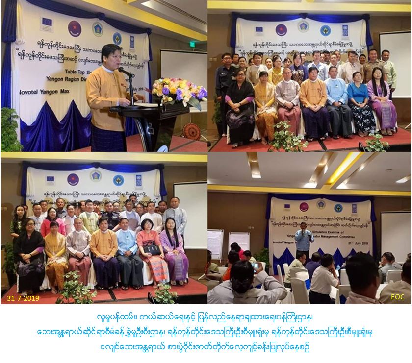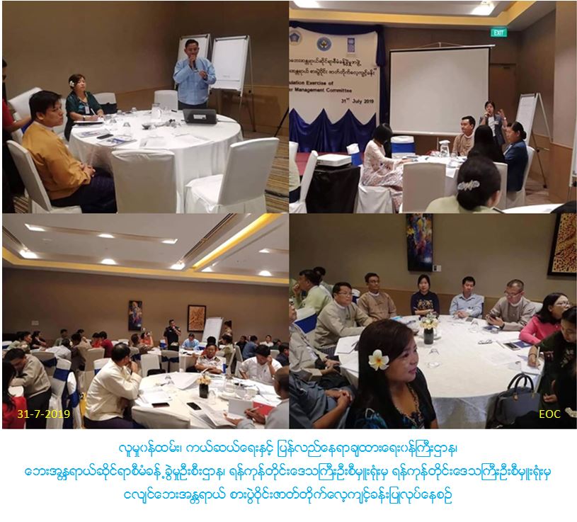 လူမှုဝန်ထမ်း၊ ကယ်ဆယ်ရေးနှင့် ပြန်လည်နေရာချထားရေးဝန်ကြီးဌာန၊ ဘေးအန္တရာယ်ဆိုင်ရာစီမံခန့်ခွဲမှုဦးစီးဌာန၊ ရန်ကုန်တိုင်းဒေသကြီးဦးစီမှူးရုံးမှ တာဝန်ရှိသူများသည် (၃၁-၇-၂၀၁၉) ရက်နေ့တွင် ရန်ကုန်တိုင်းဒေသကြီး၊ Novotel ဟိုတယ်၌ ရန်ကုန်တိုင်းဒေသကြီးအဆင့် ငလျင်ဘေးအန္တရာယ် စားပွဲဝိုင်းဇာတ်တိုက်လေ့ကျင့်ခန်းပြုလုပ်ခဲ့ပြီး တိုင်းဒေသကြီး လူမှုရေးဝန်ကြီးနှင့် တိုင်းဒေသကြီးသဘာဝဘေးကော်မတီအဖွဲ့ဝင်များ၊ ဥရောပသမဂ္ဂ၊ ကုလသမဂ္ဂနှင့် အပြည်ပြည်ဆိုင်ရာအဖွဲ့အစည်းများ၊လူမှုအသင်းအဖွဲ့များမှ တာဝန်ရှိသူများ တက်ရောက်ခဲ့ကြပါကြောင်းနှင့် စားပွဲဝိုင်းဇာတ်တိုက်လေ့ကျင့်ခန်းတွင် လုပ်ငန်းကော်မတီအလိုက် အုပ်စုခွဲ၍ ဆွေးနွေးမှုများပြုလုပ်ခဲ့ပြီး အဖွဲ့အလိုက် ဆွေးနွေးခဲ့ပါကြောင်း သတင်းရရှိ ပါသည်။