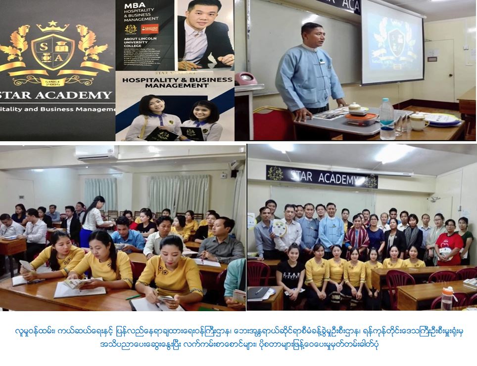 လူမှုဝန်ထမ်း၊ ကယ်ဆယ်ရေးနှင့် ပြန်လည်နေရာချထားရေးဝန်ကြီးဌာန၊ ဘေးအန္တရာယ်ဆိုင်ရာစီမံခန့်ခွဲမှုဦးစီးဌာန၊ ရန်ကုန်တိုင်းဒေသကြီးဦးစီးမှူးရုံးမှ တာဝန်ရှိသူများသည် (၃-၈-၂၀၁၉) ရက်နေ့ ၊ မြေနီကုန်းရှိ Star Academy Hospitality and Business Management သင်တန်းကျောင်းတွင် သင်တန်းကျောင်းမှဆရာ၊ ဆရာမများနှင့် ဝန်ထမ်းများ စုစုပေါင်း(၇၅)ဦးခန့်အား ဘေးအန္တရာယ်ဆိုင်ရာစီမံခန့်ခွဲမှုဦးစီးဌာန ၊ရန်ကုန်တိုင်းဒေသကြီးဦးစီးမှူးရုံးမှ အရာထမ်း၊ အမှုထမ်းများက သဘာဝဘေးအန္တရာယ်ဆိုင်ရာစီမံခန့်ခွဲမှုနှင့် ဆောင်ရွက်နေမှုအပိုင်းများအား အသိ ပညာပေးဆွေးနွေးပြီး လက်ကမ်းစာစောင်များ၊ ပိုစတာများဖြန့်ဝေပေးခဲ့ပါကြောင်း သတင်းရရှိပါသည်။