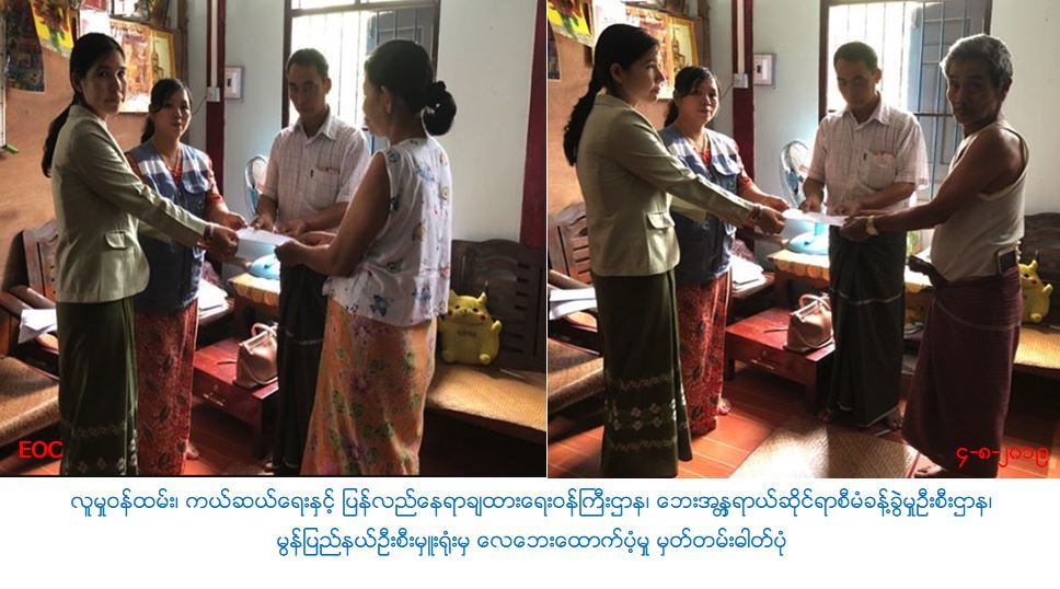 လူမှုဝန်ထမ်း၊ ကယ်ဆယ်ရေးနှင့် ပြန်လည်နေရာချထားရေးဝန်ကြီးဌာန၊ ဘေးအန္တရာယ်ဆိုင်ရာစီမံခန့်ခွဲမှုဦးစီးဌာန၊ မွန်ပြည်နယ်ဦးစီးမှူးရုံးမှ တာဝန်ရှိသူများသည် (၂-၈-၂၀၁၉)ရက်နေ့တွင် ဖြစ်ပွားခဲ့သောကျိုက်မရောမြို့နယ်၊ နိတုံကျေးရွာ၊ လေပြင်းတိုက်ခတ်မှုကြောင့် တစ်စိတ်တစ်ပိုင်းပျက်စီးခဲ့သည့် လူနေအိမ် (၈)လုံးအတွက် အိမ်ဆောက်ပစ္စည်းဖိုးငွေ (၂၉၀၀၀ဝိ/-) လူဦးရေ (၃၇)ဦးအတွက် (၇)ရက်စာဆန်ဖိုးငွေ (၇၇၇၀ဝိ/-) စုစုပေါင်းငွေ (၃၆၇၇၀ဝိ/-)အား (၃-၈-၂၀၁၉)ရက်နေ့တွင် ထောက်ပံ့ခဲ့ပါကြောင်း သတင်းရရှိပါသည်။
