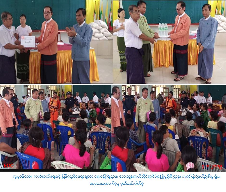 လူမှုဝန်ထမ်း၊ ကယ်ဆယ်ရေးနှင့် ပြန်လည်နေရာချထားရေးဝန်ကြီးဌာန၊ ဘေးအန္တရာယ်ဆိုင်ရာစီမံခန့်ခွဲမှုဦးစီးဌာန၊ ကရင်ပြည်နယ်ဦးစီးမှူးရုံးမှ တာဝန်ရှိသူများသည် (၃.၈.၂၀၁၉)ရက်နေ့တွင် ကရင်ပြည်နယ် ကြာအင်းဆိပ်ကြီးမြို့နယ် အမှတ်(၆)ရပ်ကွက်၌ မိုးသည်းထန်စွာရွာသွန်းပြီး ဇမိမြစ်ရေမြင့်တက်လာမှုကြောင့် ပြောင်းရွေ့နေထိုင်ရသော အိမ်ထောင်စု(၇၆)စု လူဦးရေ(၃၃၀)ဦး တို့အတွက် ဆန်ရိက္ခာဖိုးငွေ (၆၉၃၀၀၀/-)အား (၄.၈.၂၀၁၉)ရက်နေ့တွင် ကရင်ပြည်နယ် လူမှုရေးဝန်ကြီးနှင့်အတူ ကရင်ပြည်နယ်ဦးစီးမှူးရုံးမှ ထောက်ပံ့ ပေးအပ်ခဲ့ပြီးဖြစ်ပါကြောင်း သတင်းရရှိခဲ့ပါသည်။