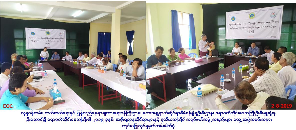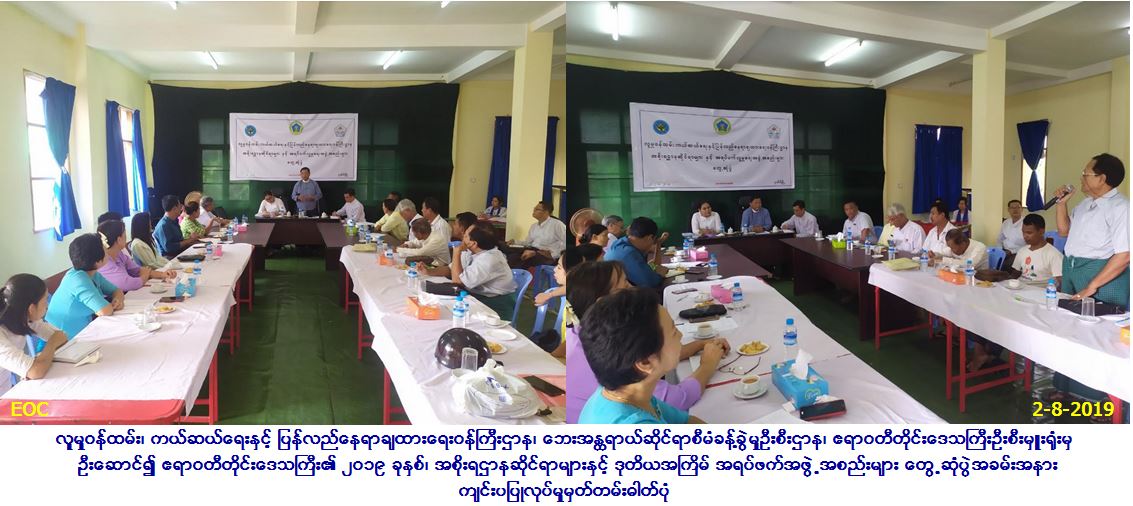 လူမှုဝန်ထမ်း၊ ကယ်ဆယ်ရေးနှင့်ပြန်လည်နေရာချထားရေးဝန်ကြီးဌာန၊ ဘေးအန္တရာယ်ဆိုင်ရာစီမံခန့်ခွဲမှုဦးစီးဌာန၊ ဧရာဝတီတိုင်းဒေသကြီးဦးစီး မှူးရုံးမှ ဦးဆောင်၍ ဧရာဝတီတိုင်းဒေသကြီး၏ ၂၀၁၉ ခုနှစ် အစိုးရဌာနဆိုင်ရာများနှင့် ဒုတိယအကြိမ် အရပ်ဖက်အဖွဲ့အစည်းများ တွေ့ဆုံပွဲ အခမ်းအနားအား ဘေးအန္တရာယ်ဆိုင်ရာစီမံခန့်ခွဲမှုဦးစီးဌာန၊ ဧရာဝတီတိုင်းဒေသကြီးဦးစီးမှူးရုံး၊ အစည်းအဝေးခန်းမတွင် (၂-၈-၂၀၁၉)ရက်နေ့ (၁၄း၀၀)နာရီအချိန်၌ ကျင်းပပြုလုပ်ခဲ့ရာ တိုင်းဒေသကြီးဦးစီးမှူး၊ ဦးသန်းစိုး(ညွှန်ကြားရေးမှူး)မှ အဖွင့်အမှာစကားနှင့် ဘေးအန္တရာယ်ဆိုင်ရာ စီမံခန့်ခွဲမှုဦးစီးဌာန၏ ဆောင်ရွက်နေသော လုပ်ငန်းများ၊ လူမှုအဖွဲ့အစည်း များအား တွေ့ဆုံရသည့် ရည်ရွယ်ချက်များအား ရှင်းလင်း ပြောကြားခဲ့ပြီး လူမှုဝန်ထမ်းဦးစီးဌာန၊ ဧရာဝတီတိုင်းဒေသကြီးဦးစီးမှူး ဒေါ်နော်သာဝါး(ညွှန်ကြားရေးမှူး)မှ လူမှုဝန်ထမ်းဦးစီးဌာန၏ ဆောင်ရွက် နေသည့် လုပ်ငန်းများအား ရှင်းလင်းပြောကြားခဲ့ပါသည်။ အဆိုပါ တွေ့ဆုံပွဲသို့ တက်ရောက်လာသည့် အရပ်ဖက်အဖွဲ့အစည်းများမှ မိမိတို့အဖွဲ့အစည်း၏ ဆောင်ရွက်နေသည့် လုပ်ငန်းများနှင့် သဘာဝဘေးဖြစ်ပေါ်လာပါက ဘေးအန္တရာယ် ဆိုင်ရာစီမံခန့်ခွဲမှုဦးစီးဌာနနှင့် ပူးပေါင်း ဆောင်ရွက်ရန်အတွက် လိုအပ်သည်များ ဆွေးနွေးတင်ပြခဲ့ပါကြောင်း သတင်းရရှိပါသည်။
