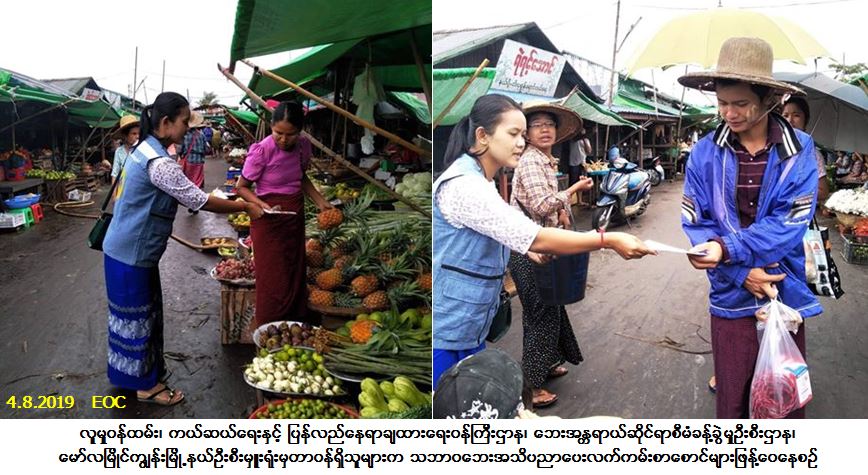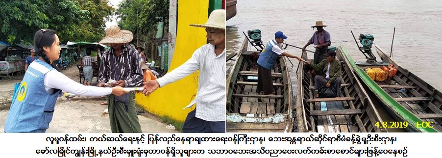 လူမှုဝန်ထမ်း၊ ကယ်ဆယ်ရေးနှင့် ပြန်လည်နေရာချထားရေးဝန်ကြီးဌာန၊ ဘေးအန္တရာယ်ဆိုင်ရာစီမံခန့်ခွဲမှုဦးစီးဌာန၊ မော်လမြိုင်ကျွန်းမြို့နယ်ဦးစီးမှူးရုံးမှတာဝန်ရှိသူများသည် (၄-၈-၂၀၁၉) ရက်နေ့၊ (၁၅း၀၀) အချိန်တွင် လပွတ္တာခရိုင်၊ မော်လမြိုင်ကျွန်းမြို့နယ်၊ ဘုရားလေးကူးတို့ဆိပ်နှင့် မြို့မဈေးအတွင်း၌ ရေဘေးနှင့် မုန်တိုင်းဘေးအန္တရာယ်များဆိုင်ရာ အသိပညာပေးလက်ကမ်းစာစောင်များ ဖြန့်ဝေခြင်းတို့ ဆောင်ရွက်ခဲ့ပါ ကြောင်း သတင်းရရှိပါသည်။