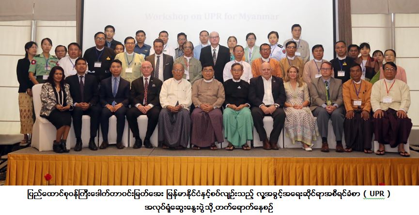 ပြည်ထောင်စုဝန်ကြီးက မိမိတို့အစိုးရအနေဖြင့် တရားဥပဒေစိုးမိုးရေးနှင့် လူမှုစီးပွားဘဝတိုးတက်ရေး ကို ကြိုးစားဆောင်ရွက်လျက်ရှိပါကြောင်း၊ မြန်မာနိုင်ငံ၏ လူ့အခွင့်အရေးများနှင့်ပတ်သက်၍ ဆောင်ရွက်လျက် ရှိရာ ပြည်သူပြည်သားများလွတ်လပ်လုံခြုံစွာ ဖွံ့ဖြိုးတိုးတက်ရေးကို ဦးတည်ဆောင်ရွက်လျက်ရှိပါကြောင်း၊ တစ်နိုင်ငံလုံးအတိုင်းအတာအနေဖြင့် တရားဥပဒေစိုးမိုးရေးကို ဆောင်ရွက်လျက်ရှိကြောင်း၊ တရားဥပဒေ စိုးမိုးမှုရရှိရန် လူတစ်ဦးချင်းစီ၏ အခြေခံအခွင့်အရေးများကို ဖေါ်ဆောင်နိုင်မည့်ဥပဒေများ ရှိရန်လိုအပ် ကြောင်း၊ ထိုဥပဒေများကို အကောင်အထည်ဖေါ်နိုင်ခြင်းသည် တရားဥပဒေစိုးမိုးခြင်းဖြစ်ကြောင်း၊ လူတစ်ဦးချင်းစီ၏ အခွင့်အရေးများလည်း ရရှိလာမည်ဖြစ်ကြောင်း၊ အစိုးရဝန်ကြီးဌာနအသီးသီးသည် မိမိတို့ ဝန်ကြီးဌာနက တာဝန်ယူဆောင်ရွက်ရသည့် လုပ်ငန်းအလိုက် ဥပဒေများဖေါ်ဆောင်ခြင်းဖြင့် ပြည်သူများ အခြေခံလူ့အခွင့်အရေးများ ခံစားရရှိအောင် ဆောင်ရွက်လျက်ရှိကြောင်း၊ ယနေ့အလုပ်ရုံဆွေးနွေးပွဲတွင် မြန်မာနိုင်ငံ၏လူ့အခွင့်အရေး ဖေါ်ဆောင်မှုများကို UPR လုပ်ငန်းစဉ်ဖြင့် ကမ္ဘာကသိအောင် ဆောင်ရွက်ပေးနိုင်ရန် ပူးပေါင်းဆွေးနွေးကြမည်ဖြစ်ကြောင်း၊ UPR ဟုခေါ်သည့် Universal Periodic Review လုပ်ငန်းစဉ်ကို ၂၀၀၆ ခုနှစ်တွင် အစပြုခဲ့ပြီး ကုလသမဂ္ဂအဖွဲ့ဝင်နိုင်ငံများက နိုင်ငံအလိုက် ဆောင်ရွက်လျက် ရှိသော လူ့အခွင့်အရေးဆိုင်ရာများကို အစီရင်ခံစာ တင်သွင်းခြင်းဖြစ်ကြောင်း၊ မြန်မာနိုင်ငံအနေဖြင့် ပထမအကြိမ်အစီရင်ခံစာအား ၂၀၁၁ ခုနှစ်တွင်လည်းကောင်း၊ ဒုတိယအကြိမ်ကို ၂၀၁၅ ခုနှစ်တွင် လည်းကောင်း လူ့အခွင့်အရေးဆိုင်ရာ မဟာမင်းကြီးရုံးသို့တင်သွင်းခဲ့ကြောင်း၊ တတိယအကြိမ်အစီရင်ခံစာကို ၂၀၂၀ ပြည့်နှစ် နိုဝင်ဘာလတွင် တင်သွင်းရမည်ဖြစ်ကြောင်း၊ အဖွဲ့ဝင်နိုင်ငံပေါင်း (၉၃) နိုင်ငံမှ အကြံပြုတိုက် တွန်းချက် (၂၈၁) ချက်အနက် (၁၆၆) ချက်ကို မြန်မာနိုင်ငံကလက်ခံခဲ့ပြီး ကဏ္ဍ (၁၂) ရပ် ခွဲကာ လုပ်ငန်းကော်မတီ (၁၂) ရပ်ဖြင့် ဖွဲ့စည်းဆောင်ရွက်လျက်ရှိပါကြောင်း၊ မိမိတို့ဝန်ကြီးဌာနအနေဖြင့် ကျား/မ တန်းတူညီတူရှိမှု မြှင့်တင်ရေးနှင့်ထိခိုက်ခံစားလွယ်သော အုပ်စုများ ကာကွယ်ရေးဆိုင်ရာလုပ်ငန်းကော်မတီနှင့် ခွဲခြားမှုမပြုရေးဆိုင်ရာလုပ်ငန်းကော်မတီ (၂) ရပ်တို့တွင် အကြံပြုချက် ပေါင်း (၃၀)ကို အကောင်အထည်ဖေါ် ဆောင်ရွက်မှုများနှင့် ပတ်သက်၍ အစီရင်ခံစာ တင်သွင်းမည်ဖြစ်ကြောင်း၊ ကလေးသူငယ်အခွင့်အရေးနှင့် ပတ်သက်ပြီး မြန်မာနိုင်ငံအနေဖြင့် အစီရင်ခံစာ (၃) ကြိမ်တင်သွင်းထားခဲ့ပြီး ပဉ္စမနှင့် ဆဌမအကြိမ်နိုင်ငံအဆင့် ပူးတွဲအစီရင်ခံစာ တင်ပြနိုင်ရေးဆောင်ရွက်လျက