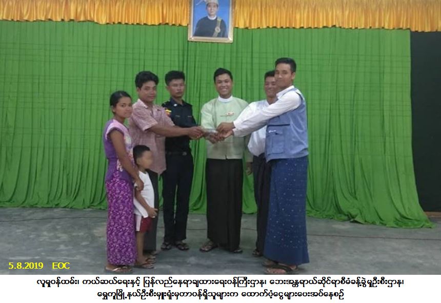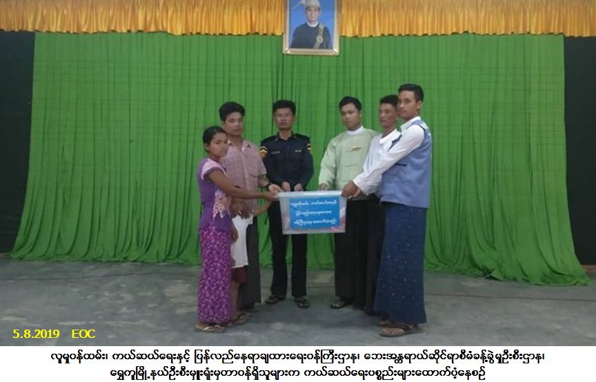 လူမှုဝန်ထမ်း၊ ကယ်ဆယ်ရေးနှင့် ပြန်လည်နေရာချထားရေးဝန်ကြီးဌာန၊ ဘေးအန္တရာယ်ဆိုင်ရာစီမံခန့်ခွဲမှုဦးစီး ဌာန၊ ရွှေကူမြို့နယ်ဦးစီးမှူးရုံးမှတာဝန်ရှိသူများသည် ဗန်းမော်ခရိုင်၊ ရွှေကူမြို့နယ်၊ မြို့လှမြို့၊ အမှတ် (၃) ရပ်ကွက်၌ (၃-၈-၂၀၁၉) ရက်နေ့တွင် ဖြစ်ပွားခဲ့သောမီးဘေးကြောင့် အိမ်ထောင်စု (၁) စု၊ လူဦးရေ (၃) ဦး ဘေးသင့်ခဲ့ရာ အဆိုပါဘေးသင့်ပြည်သူများအတွက် ကယ်ဆယ်ရေးပစ္စည်း (၁၇) မျိုး အိမ်ထောင်စု (၁) စုစာ၊ ဆန်ရိက္ခာ (၇) ရက်စာဖိုးထောက်ပံ့ငွေ (၆၃၀၀/-) ကျပ်၊ အိမ်ဆောက်ပစ္စည်းဖိုးထောက်ပံ့ငွေ (၁၀၀,၀၀၀/-) ကျပ်တို့ကို (၅-၈-၂၀၁၉) ရက်နေ့၊ (၁ရး၃၀)နာရီအချိန်တွင် မီးသတ်ဦးစီးဌာနမှတာဝန်ရှိသူများ၊ မြို့လှမြို့အုပ်ချုပ်ရေးမှူး၊ ရပ်ကွက်အုပ်ချုပ်ရေးမှူးနှင့်အတူ ဘေးသင့်ပြည်သူများထံသို့ လက်ဝယ်အရောက် သွားရောက်ထောက်ပံ့ခဲ့ပါကြောင်း သတင်းရရှိပါသည်။