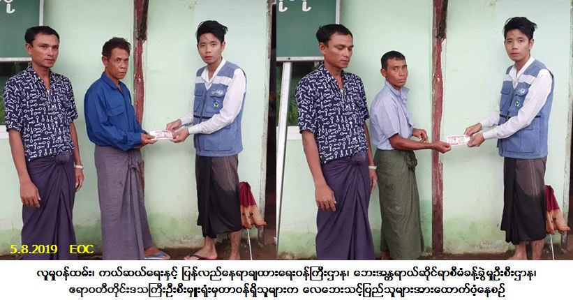 လူမှုဝန်ထမ်း၊ ကယ်ဆယ်ရေးနှင့် ပြန်လည်နေရာချထားရေးဝန်ကြီးဌာန၊ ဘေးအန္တရာယ်ဆိုင်ရာစီမံခန့်ခွဲမှုဦးစီး ဌာန၊ ဧရာဝတီတိုင်းဒသကြီးဦးစီးမှူးရုံးမှတာဝန်ရှိသူများသည် ပုသိမ်ခရိုင်၊ ပုသိမ်မြို့နယ်၊ ရေမနေပင်ကိုင်းကျေးရွာအုပ်စု၊ ရေမနေပင်ကိုင်းကျေးရွာ၌ (၂-၈-၂၀၁၉) ရက်နေ့တွင်ဖြစ်ပွားခဲ့သော လေဘေးကြောင့် တစ်စိတ်တစ်ပိုင်းပျက်စီးနေအိမ် (၂) လုံး၊ အိမ်ထောင်စု (၂) စုမှ လူဦးရေ (၆) ဦးဘေးသင့်ခဲ့ရာ အဆိုပါဘေးသင့်ပြည်သူများအတွက် ဆန်ရိက္ခာ (၇) ရက်စာဖိုးထောက်ပံ့ငွေ (၁၂,၆၀၀/-) ကျပ်နှင့် အိမ်ဆောက်ပစ္စည်းဖိုးထောက်ပံ့ငွေ (၁၀၀,၀၀၀/-) ကျပ်တို့ကို (၅-၈-၂၀၁၉) ရက်နေ့၊ (၁၆း၀၀)နာရီအချိန်တွင် ဘေးသင့်ပြည်သူများထံသို့ လက်ဝယ်အရောက်ထောက်ပံ့ပေးအပ်ခဲ့ပါကြောင်း သတင်းရရှိပါသည်။