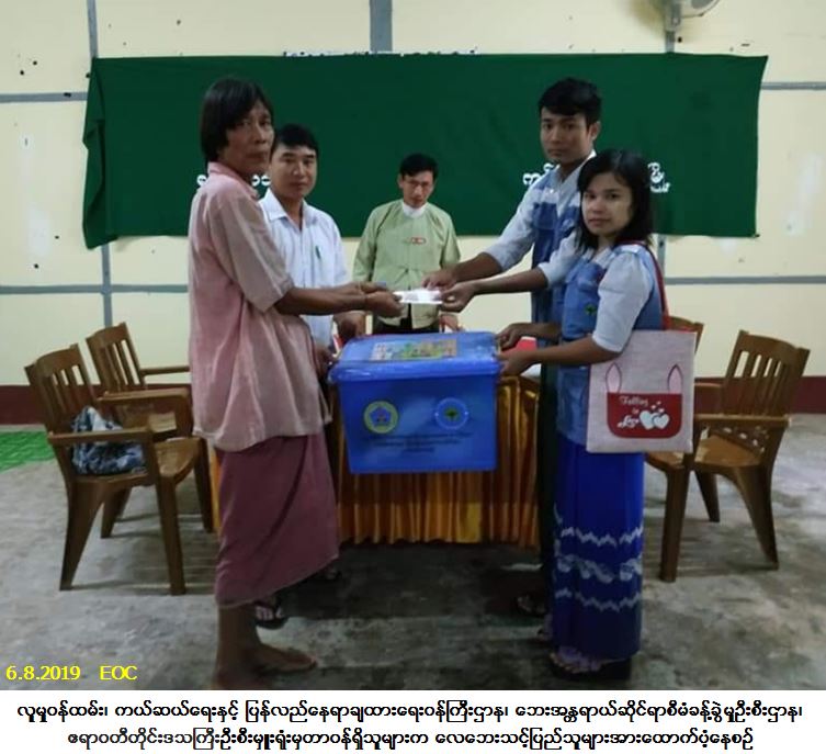 လူမှုဝန်ထမ်း၊ ကယ်ဆယ်ရေးနှင့် ပြန်လည်နေရာချထားရေးဝန်ကြီးဌာန၊ ဘေးအန္တရာယ်ဆိုင်ရာစီမံခန့်ခွဲမှုဦးစီး ဌာန၊ ဧရာဝတီတိုင်းဒသကြီးဦးစီးမှူးရုံးမှတာဝန်ရှိသူများသည် ကန်ကြီးထောင့်မြို့နယ်၊ လဟာကလူကျေးရွာ အုပ်စု၊ ဂွေးကုန်းကျေးရွာ၌ (၂-၈-၂၀၁၉) ရက်နေ့တွင် ဖြစ်ပွားခဲ့သောလေဘေးကြောင့် ပြိုကျပျက်စီးနေအိမ် (၁) လုံး၊ အိမ်ထောင်စု (၁) စုမှ လူဦးရေ (၃) ဦးဘေးသင့်ခဲ့ရာ အဆိုပါဘေးသင့်ပြည်သူများအတွက် ကယ်ဆယ်ရေးပစ္စည်း (၁၆) မျိုးအိမ်ထောင်စု (၁) စုစာ၊ အိမ်ဆောက်ပစ္စည်းဖိုးထောက်ပံ့ငွေ (၁၀၀,၀၀၀/-) ကျပ်၊ ဆန်ရိက္ခာ (၇) ရက်စာဖိုးထောက်ပံ့ငွေ (၆,၃၀၀/-) ကျပ်တို့ကို (၆-၈-၂၀၁၉) ရက်နေ့၊ (၁၁း၀၀)နာရီအချိန်တွင် ဘေးသင့်ပြည်သူများလက်ဝယ်အရောက် ထောက်ပံ့ပေးအပ်ခဲ့ပါကြောင်းသတင်းရရှိပါသည်။
