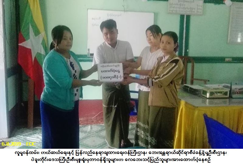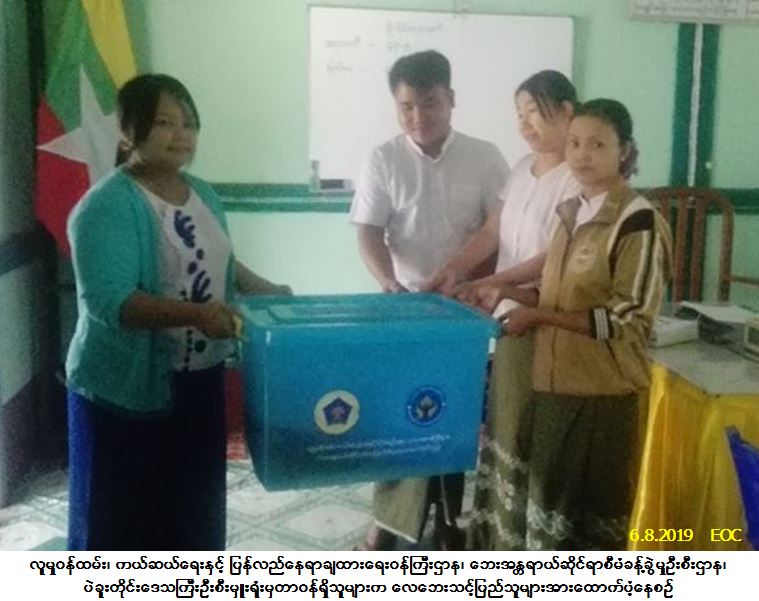 လူမှုဝန်ထမ်း၊ ကယ်ဆယ်ရေးနှင့် ပြန်လည်နေရာချထားရေးဝန်ကြီးဌာန၊ ဘေးအန္တရာယ်ဆိုင်ရာစီမံခန့်ခွဲမှုဦးစီး ဌာန၊ ပဲခူးတိုင်းဒေသကြီးဦးစီးမှူးရုံးမှတာဝန်ရှိသူများသည် ပဲခူးတိုင်းဒေသကြီး၊ သာယာဝတီခရိုင်၊ လက်ပံတန်းမြို့နယ်၊ ခမုံဆိပ်ကျေးရွာအုပ်စု၊ ကျောက်အိုင်ရွာ၌ (၃-၈-၂၀၁၉) ရက်နေ့တွင် ဖြစ်ပွားခဲ့သော လေဘေးကြောင့် ပြိုလဲနေအိမ် (၁) လုံး၊ အိမ်ထောင်စု (၁) စုမှ လူဦးရေ (၄) ဦးဘေးသင့်ခဲ့ရာ အဆိုပါဘေးသင့်ပြည်သူများအတွက် အိမ်ဆောက်ပစ္စည်းဖိုးထောက်ပံ့ငွေ (၁၀၀,၀၀၀/-)ကျပ်၊ ဆန်ရိက္ခာဖိုးထောက်ပံငွေ (၈,၄၀၀/-) ကျပ်၊ ကယ်ဆယ်ရေးပစ္စည်း (၁၅) မျိုး အိမ်ထောင်စု(၁)စာတို့ကို (၆-၈-၂၀၁၉) ရက်နေ့၊ (၁၁:၃ဝ) နာရီအချိန်တွင် လက်ပံတန်းမြို့နယ်အထွေထွေအုပ်ချုပ်ရေးဦးစီးဌာနရုံး၌ မြို့နယ်အုပ်ချုပ်ရေးမှူးရုံးမှတာဝန်ရှိသူများ၊ သက်ဆိုင်ရာကျေးရွာအုပ်ချုပ်ရေးမှူးနှင့်အတူ ဘေးသင့်ပြည်သူ များထံသို့ လက်ဝယ်အရောက်သွားရောက်ထောက်ပံ့ခဲ့ပါကြောင်း သတင်းရရှိပါသည်။