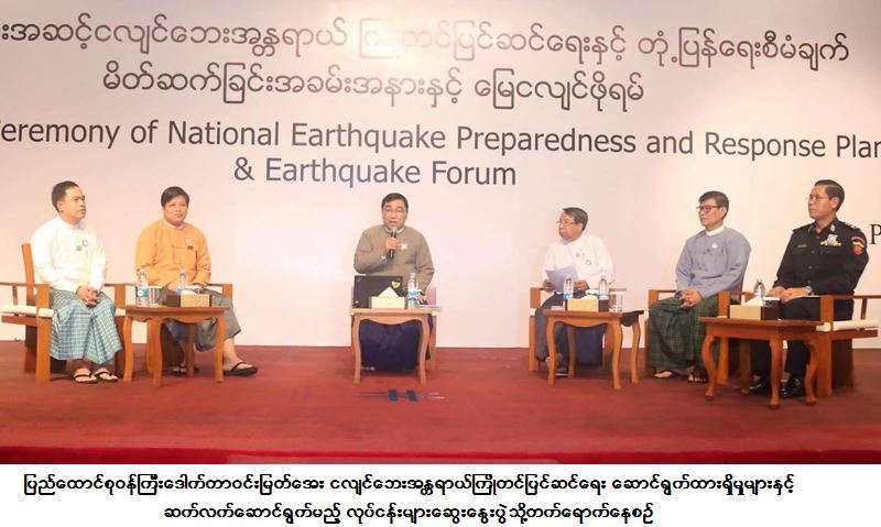 ငလျင်ဘေး အန္တရာယ်ကြိုတင်ပြင်ဆင်ရေး ဆောင်ရွက်ထားရှိမှုများနှင့် ဆက်လက်ဆောင်ရွက်မည့် လုပ်ငန်းများ ဆွေးနွေးပွဲ အစီအစဉ်ကို ယနေ့ နံနက်ပိုင်းတွင် နေပြည်တော်၊ သင်္ဂဟဟိုတယ်၌ ကျင်းပရာ “ငလျင်ဘေး အန္တရာယ်ကြိုတင်ပြင်ဆင်ရေးအတွက် လက်ရှိဆောင်ရွက် ထားမှုများ” ခေါင်းစဉ်ဖြင့် ဆွေးနွေးခြင်း တွင် လူမှုဝန်ထမ်း၊ ကယ်ဆယ်ရေးနှင့် ပြန်လည်နေရာချထားရေးဝန်ကြီးဌာန ပြည်ထောင်စုဝန်ကြီး ဒေါက်တာဝင်းမြတ်အေးက Chair အဖြစ်လည်းကောင်း၊ မြန်မာနိုင်ငံအင်ဂျင်နီယာအသင်း ဥက္ကဋ္ဌ ဦးအောင်မြင့်က Co-Chair အဖြစ်လည်းကောင်း ဆောင်ရွက်ပြီး ရန်ကုန်တိုင်းဒေသကြီး သဘာဝဘေးအန္တရာယ် ဆိုင်ရာစီမံခန့်ခွဲမှုအဖွဲ့မှ လူမှုရေးဝန်ကြီး ဦးနိုင်ငံလင်း၊ မန္တလေးတိုင်းဒေသကြီး သဘာဝဘေးအန္တရာယ်ဆိုင်ရာ စီမံခန့်ခွဲမှုအဖွဲ့မှ အတွင်းရေးမှူး ညွှန်ကြားရေးမှူးဦးအေးမင်းသူ၊ မီးသတ်ဦးစီးဌာနမှ ညွှန်ကြားရေးမှူး ဦးစိုးဝင်းနှင့် မိုးလေဝသနှင့် ဇလဗေဒညွှန်ကြားမှုဦးစီးဌာနမှ ဒုတိယညွှန်ကြားရေးမှူး ဒေါက်တာယဉ်မျိုးမင်းထွေး တို့က ပါဝင်ဆွေးနွေးခဲ့ကြပါသည်။