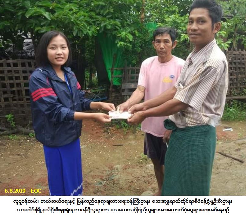 လူမှုဝန်ထမ်း၊ ကယ်ဆယ်ရေးနှင့် ပြန်လည်နေရာချထားရေးဝန်ကြီးဌာန၊ ဘေးအန္တရာယ်ဆိုင်ရာစီမံခန့်ခွဲမှုဦးစီး ဌာန၊ သာပေါင်းမြို့နယ်ဦးစီးမှူးရုံးမှတာဝန်ရှိသူများသည် သာပေါင်းမြို့နယ်၊ တောင်ကလေးကျေးရွာအုပ်စု၊ ဆင်ကူးတန်းကျေးရွာ၌ (၅-၈-၂၀၁၉) ရက်နေ့တွင် ဖြစ်ပွားခဲ့သောလေဘေးကြောင့် အမိုးလန်နေအိမ်(၁) လုံးအတွက် အိမ်ဆောက်ပစ္စည်းဖိုးထောက်ပံ့ငွေ (၃၀,၀၀၀/-) ကျပ်၊ ဘေးသင့်လူဦးရေ (၅) ဦးအတွက် ဆန်ရိက္ခာ(၇)ရက်စာဖိုးထောက်ပံ့ငွေ (၁၀,၅၀၀/-) ကျပ်တို့ကို (၆-၈-၂၀၁၉) ရက်နေ့၊ (၁၆း၁၅)နာရီအချိန်တွင် ဘေးသင့်ပြည်သူများလက်ဝယ်အရောက် ထောက်ပံ့ပေးအပ်ခဲ့ပါကြောင်း သတင်းရရှိပါသည်။
