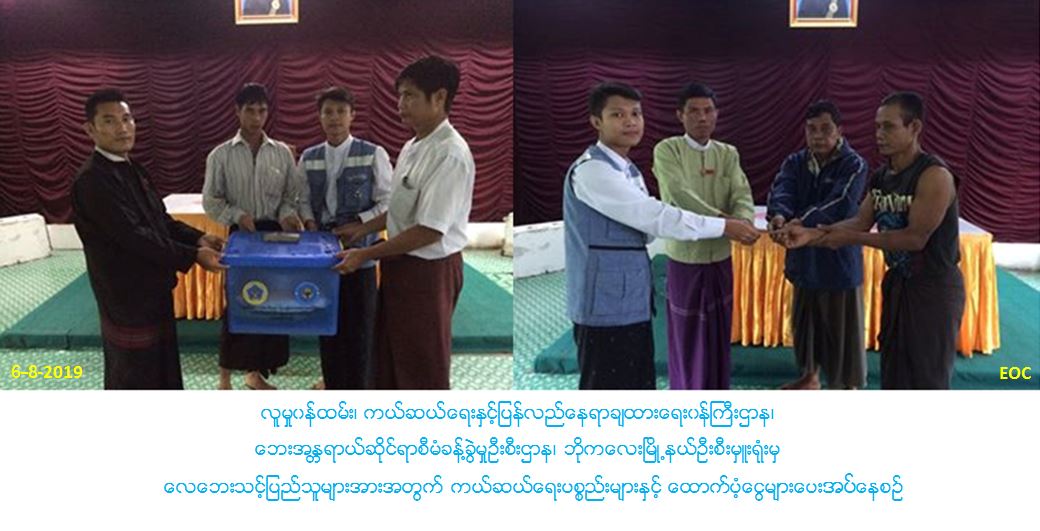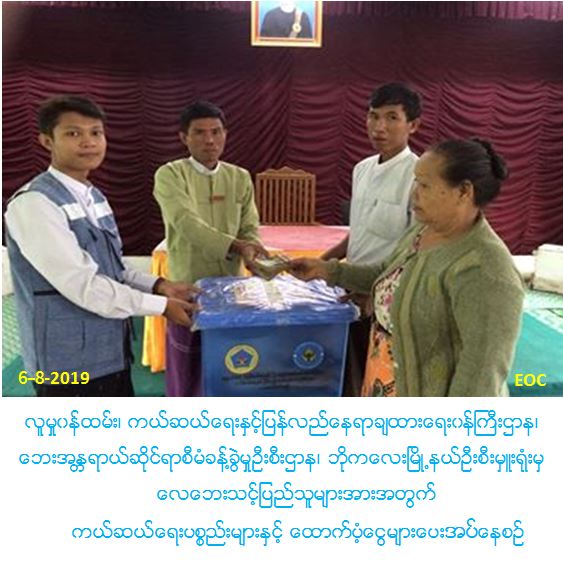လူမှုဝန်ထမ်း၊ ကယ်ဆယ်ရေးနှင့် ပြန်လည်နေရာချထားရေးဝန်ကြီးဌာန၊ ဘေးအန္တရာယ်ဆိုင်ရာစီမံခန့်ခွဲမှုဦးစီးဌာန၊ ဘိုကလေးမြို့နယ်ဦးစီးမှူးရုံးမှ တာဝန်ရှိသူများသည် ဘိုကလေး မြို့နယ်၊ ကွင်းဘုန်းကြီးကျေးရွာအုပ်စု၊ ရွှေဘိုစုကျေးရွာတွင်(၃-၈-၂၀၁၉)ရက်နေ့တွင် ဖြစ်ပွားခဲ့သော လေဘေးကြောင့် ပြိုကျပျက်စီး(ဓနိမိုး၊ဓနိကာ၊ပျဉ်ခင်း)(၁)လုံးအတွက် အိမ်ဆောက်ပစ္စည်းဖိုး ထောက်ပံ့ငွေ(၁၀၀၀၀၀/-)ကျပ်၊ ဘေးသင့်လူဦးရေ(၅)ဦးအတွက် ဆန်ရိက္ခာ(၇)ရက်စာဖိုးထောက်ပံ့ငွေ (၁၀၅၀၀/-)ကျပ်၊ ကယ်ဆယ်ရေးပစ္စည်း(၁၆)မျိုး(၁) အိမ်ထောင်စာတန်ဖိုး (၃၇၇၅၃/-)ကျပ်၊ စုစုပေါင်းထောက်ပံ့ငွေတန်ဖိုး(၁၄၈၂၅၃/-)ကျပ်တို့ကိုလည်းကောင်း၊ ဘိုကလေးမြို့နယ်၊ ဘိုးရောင်ကျေးရွာအုပ်စု၊ ကျုံခရိုင်ကျေးရွာတွင်(၃-၈-၂၀၁၉)ရက်နေ့တွင် ဖြစ်ပွားခဲ့သော လေဘေးကြောင့် ပြိုကျပျက်စီး(ဓနိမိုး၊ ဓနိကာ၊ ပျဉ်ခင်း)အိမ်(၁)လုံးအတွက် အိမ်ဆောက်ပစ္စည်းဖိုးထောက်ပံ့ငွေ (၁၀၀၀၀၀/-)ကျပ်၊ ဘေးသင့်လူဦးရေ (၄)ဦးအတွက် ဆန်ရိက္ခာ (၇)ရက်စာဖိုးထောက်ပံ့ငွေ (၈၄၀၀/-)ကျပ်၊ ကယ်ဆယ်ရေးပစ္စည်း (၁၆)မျိုး (၁) အိမ်ထောင်စာ တန်ဖိုး-(၃၇၇၅၃/-)၊ စုစုပေါင်း ထောက်ပံ့ငွေတန်ဖိုး(၁၄၆၁၅၃/-)ကျပ်တို့အားလည်းကောင်း၊ ဘိုကလေးမြို့နယ်၊ မလော့ကျေးရွာအုပ်စု၊ ကိုင်းတောကျေးရွာတွင်(၃-၈-၂၀၁၉)ရက်နေ့တွင် ဖြစ်ပွားခဲ့သော လေဘေးကြောင့် အမိုးလန်ပျက်စီး အိမ်(၁)လုံး အတွက် အိမ်ဆောက်ပစ္စည်းဖိုးထောက်ပံ့ငွေ (၅၀၀၀၀/-)ကျပ်၊ ဘေးသင့်လူဦးရေ(၅) ဦးအတွက် ဆန်ရိက္ခာ(၇)ရက်စာဖိုးထောက်ပံ့ငွေ (၁၀၅၀၀/-)ကျပ်၊ စုစုပေါင်းထောက်ပံ့ငွေ တန်ဖိုး(၆၀၅၀၀/-)ကျပ်တို့ကို (၆-၈-၂၀၁၉)ရက်နေ့ နေ့လည်(၁၁း၀၀)နာရီအချိန်တွင် ဘိုကလေးမြို့နယ်အထွေထွေအုပ်ချုပ်ရေးဦးဌာနမှတာဝန်ရှိသူများ လွှတ်တော်ကိုယ်စားလှယ်များ ရှေ့မှောက်တွင် ဘေးသင့်ပြည်သူများ လက်ဝယ်သို့ထောက်ပံ့ပေးအပ်ခဲ့ပါကြောင့် သတင်းရရှိပါသည်။