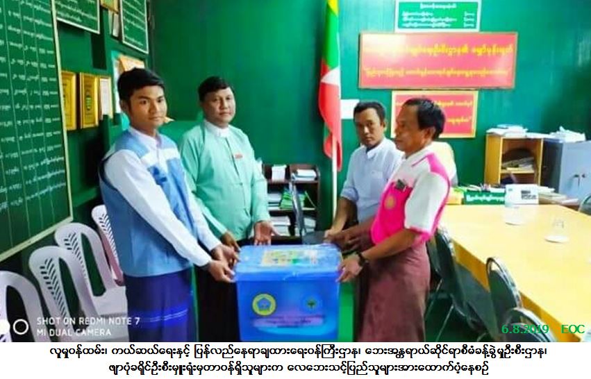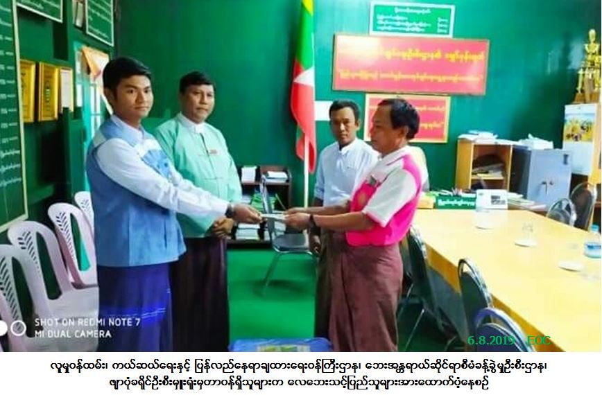 လူမှုဝန်ထမ်း၊ ကယ်ဆယ်ရေးနှင့် ပြန်လည်နေရာချထားရေးဝန်ကြီးဌာန၊ ဘေးအန္တရာယ်ဆိုင်ရာစီမံခန့်ခွဲမှုဦးစီး ဌာန၊ ဖျာပုံခရိုင်ဦးစီးမှူးရုံးမှတာဝန်ရှိသူများသည် ကျိုက်လတ်မြို့နယ်၊ ကျောက်ထရံလေးကျေးရွာ၌ (၄-၈-၂၀၁၉) ရက်နေ့တွင် ဖြစ်ပွားခဲ့သော လေဘေးကြောင့် ပြိုလဲပျက်စီးနေအိမ် (၁) လုံးမှ လူဦးရေ (၅) ဦးဘေးသင့်ခဲ့ရာ အဆိုပါဘေးသင့်ပြည်သူအတွက် ကယ်ဆယ်ရေးပစ္စည်း (၁၆) မျိုး အိမ်ထောင်စု (၁) စုစာ၊ အိမ်ဆောက်ပစ္စည်းထောက်ပံ့ငွေ (၂၀၀,၀၀၀/-) ကျပ်၊ ဆန်ရိက္ခာဖိုးထောက်ပံ့ငွေ (၁၀,၅၀၀/-) ကျပ်တို့ကို (၆-၈-၂၀၁၉) ရက်နေ့တွင် ဘေးသင့်ပြည်သူများလက်ဝယ်အရောက် ထောက်ပံ့ပေးအပ်ခဲ့ပါကြောင်း သတင်းရရှိပါသည်။