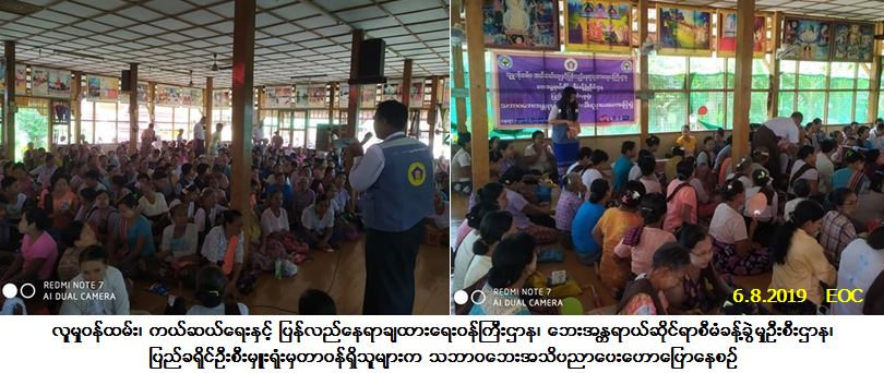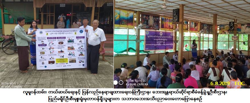 လူမှုဝန်ထမ်း၊ ကယ်ဆယ်ရေးနှင့် ပြန်လည်နေရာချထားရေးဝန်ကြီးဌာန၊ ဘေးအန္တရာယ်ဆိုင်ရာစီမံခန့်ခွဲမှုဦးစီး ဌာန၊ ပြည်ခရိုင်ဦးစီးမှူးရုံးမှတာဝန်ရှိသူများသည် (၆-၈-၂၀၁၉) ရက်နေ့တွင် ပြည်ခရိုင်၊ ရွှေတောင်မြို့နယ်၊ သရက်တောရပ်ကွက်၌ သဘာဝဘေးအသိပညာပေးဟောပြောပွဲကျင်းပပြုလုပ်ခဲ့ရာ ရပ်ကွက်သူ/သား (၂၀၀) ဦးခန့်တက်ရောက်ခဲ့ပြီး တက်ရောက်လာသူများအား လက်ကမ်းစာစောင်နှင့် မိုးကြိုးဘေးအသိပညာ ပေးပိုစတာများ၊ ခါက်ဆွဲခြောက်ထုပ်များကို ဖြန့်ဝေခဲ့ပါကြောင်း သတင်းရရှိပါသည်။