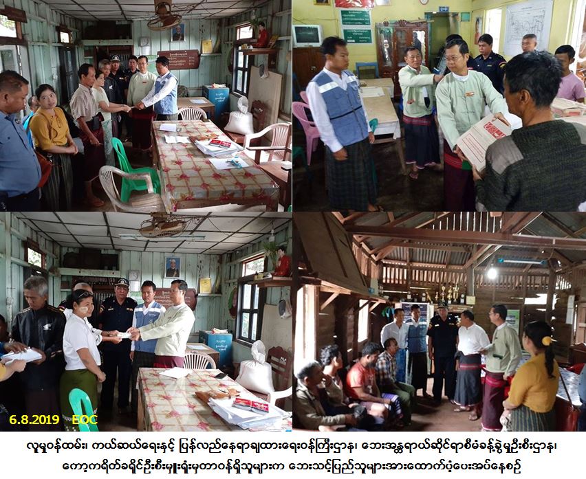 လူမှုဝန်ထမ်း၊ ကယ်ဆယ်ရေးနှင့် ပြန်လည်နေရာချထားရေးဝန်ကြီးဌာန၊ ဘေးအန္တရာယ်ဆိုင်ရာစီမံခန့်ခွဲမှုဦးစီး ဌာန၊ ကော့ကရိတ်ခရိုင်ဦးစီးမှူးရုံးမှတာဝန်ရှိသူများသည် ကရင်ပြည်နယ်၊ ကော့ကရိတ်ခရိုင်၊ ကော့ကရိတ် မြို့နယ်ရှိ ရပ်ကွက်/ကျေးရွာများ၌ (၃-၈-၂၀၁၉) ရက်နေ့တွင် ဖြစ်ပွားခဲ့သော မိုးသည်းထန်စွာရွာသွန်းပြီး လေပြင်းတိုက်ခတ်မှုကြောင့် တစ်စိတ်တစ်ပိုင်းပျက်စီးနေအိမ် (၄) လုံး အတွက် အိမ်ဆောက်ပစ္စည်းဖိုး ထောက်ပံ့ငွေ (၄၀၀,၀၀၀/-) ကျပ်၊ ဘေးသင့်အိမ်ထောင်စု (၄) စုမှ လူဦးရေ (၂၇) ဦး အတွက်ဆန်ရိက္ခာ (၇) ရက်စာဖိုးထောက်ပံ့ငွေ (၅၆,၇၀၀/-) ကျပ်တို့ကိုလည်းကောင်း၊ (၃-၈-၂၀၁၉) ရက်နေ့တွင် ဖြစ်ပွားခဲ့သော ရေဘေးကြောင့် နီးစပ်ရာဆွေမျိုးများအိမ်သို့ ပြောင်းရွှေ့အိမ်ထောင်စု (၅၈) စုမှ လူဉ်ီးရေ (၂၈၂) ဦးတို့အတွက် ဆန်ရိက္ခာ (၇) ရက်စာဖိုးထောက်ပံ့ငွေ (၅၉၂,၂၀၀/-) ကျပ်တို့ကိုလည်းကောင်း (၆-၈-၂၀၁၉) ရက်နေ့တွင် ကော့ကရိတ်မြို့နယ် အထွေထွေအုပ်ချုပ်ရေးဦးစီးဌာနမှ တာဝန်ရှိသူများနှင့်အတူ သွားရောက်ထောက်ပံ့ ပေးအပ်ခဲ့ပါကြောင်း သတင်းရရှိပါသည်။
