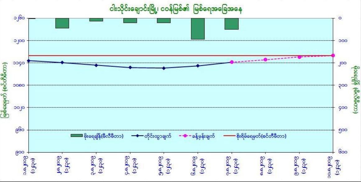 ယနေ့မြန်မာစံတော်ချိန် (၁၂:၃၀)နာရီအချိန် တိုင်းထွာချက်အရ ငဝန်မြစ်ရေသည် ငါးသိုင်းချောင်းမြို့တွင် ယင်းမြို့၏ စိုးရိမ်ရေမှတ်အောက် ပေဝက်ခန့်တွင် ရောက်ရှိနေပါသည်။ အဆိုပါမြစ်ရေသည် နောက်(၃)ရက်အတွင်း ယင်းမြို့၏ စိုးရိမ်ရေမှတ်သို့ ရောက်ရှိနိုင်ပါတယ်။