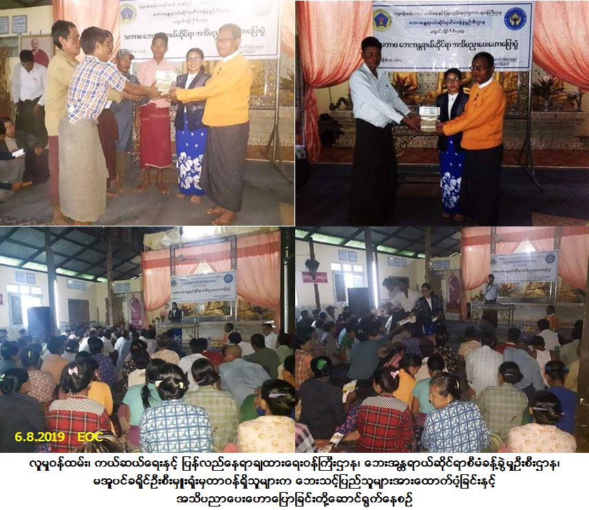 လူမှုဝန်ထမ်း၊ ကယ်ဆယ်ရေးနှင့် ပြန်လည်နေရာချထားရေးဝန်ကြီးဌာန၊ ဘေးအန္တရာယ်ဆိုင်ရာစီမံခန့်ခွဲမှုဦးစီး ဌာန၊ မအူပင်ခရိုင်ဦးစီးမှူးရုံးမှတာဝန်ရှိသူများသည် မအူပင်ခရိုင်၊ မအူပင်မြို့နယ်၊ အောက်ထုံးကျေးရွာအုပ်စုရှိ ကျေးရွာ (၅) ရွာ၌ (၄-၈-၂၀၁၉) ရက်နေ့တွင် ဖြစ်ပွားခဲ့သော ကမ်းပြိုဘေးနှင့် လေဘေးတို့ကြောင့် ကြိုတင်ရွှေ့ပြောင်းဖျက်သိမ်းနေအိမ် (၃၁)လုံး၊ အမိုးလန်ပျက်စီးနေအိမ် (၆) လုံးတို့ရှိ အိမ်ထောင်စု (၃၇) စုမှ လူဦးရေ (၁၇၀)ဦးတို့အတွက် အိမ်ဆောက်ပစ္စည်းဖိုးထောက်ပံ့ငွေ (၃,၂၈၀,ဝဝဝ/-) ကျပ်၊ ဆန်ရိက္ခာ(၇)ရက်စာ ဖိုးထောက်ပံ့ငွေ (၃၅၇,၀၀၀/-) ကျပ်တို့ကို (၆-၈-၂၀၁၉) ရက်နေ့ (၁၂း၃၀)နာရီအချိန်တွင် မအူပင်မြို့နယ်တိုင်းဒေသကြီးလွှတ်တော်ကိုယ်စားလှယ်၊ မြို့နယ်အထွေထွေအုပ်ချုပ်ရေးဦးစီးဌာနမှ တာဝန်ရှိသူများနှင့်အတူ ဘေးသင့်ပြည်သူများ လက်ဝယ်အရောက် ထောက်ပံ့ပေးအပ်ခဲ့ပါသည်။ ဆက်လက်၍ အောက်ထုံးကျေးရွာအုပ်စုအတွင်းရှိ ကျေးရွာ (၉) ရွာမှ ပြည်သူလူထု (၂၀၀) ဦးအား သဘာဝဘေးအသိပညာပေးဟောပြောခဲ့ပြီး ဘေး(၈) မျိုးပါ လက်ကမ်းစာဆောင်များ ဖြန့်ဝေပေးခဲ့ပါကြောင်း သတင်းရရှိပါသည်။
