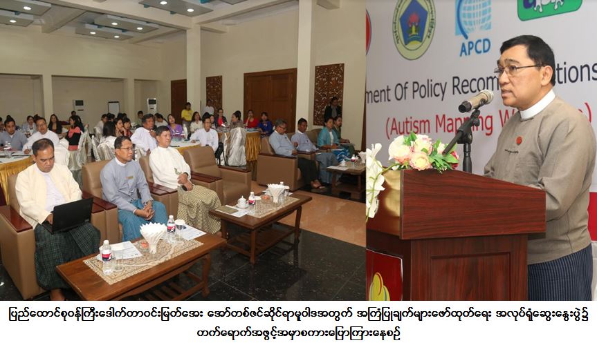 ပြည်ထောင်စုဝန်ကြီးက အော်တစ်ဇင်သည် မသန်စွမ်းအမျိုးအစား တစ်ခုဖြစ်ကြောင်း၊ မြန်မာနိုင်ငံတွင် အော်တစ်ဇင်အသင်းကို ဖွဲ့စည်းဆောင်ရွက်လျက်ရှိကြောင်း၊ ကမ္ဘာ့နိုင်ငံများတွင် အော်တစ်ဇင်ဆိုင်ရာ ဆောင်ရွက်ချက်များနှင့် နှိုင်းယှဉ်ပါက မြန်မာအော်တစ်ဇင်အသင်း၏ လုပ်ဆောင်ချက်များသည် လွန်စွာနောက် မကျပါကြောင်း၊ ဆက်လက်၍ အရှိန်မြှင့်တင်ဆောင်ရွက်သွားဖို့ အားပေးပါကြောင်း၊ အော်တစ်ဇင်ကိုအဓိပ္ပာယ် သတ်မှတ်ရန်မှာ ခက်ခဲပါကြောင်း၊ အော်တစ်ဇင်နှင့်ပတ်သက်၍ နိုင်ငံအပေါ်သက်ရောက်မှု မည်မျှရှိသည်ကို မသိကြသေးပါကြောင်း၊ အော်တစ်ဇင်အကြောင်း ပြည်သူသိရှိရန်နှင့် ဖြစ်ပွားနေမှု အခြေအနေအတိအကျ သိရှိရန် ပူးပေါင်းဆောင်ရွက်ရမည်ဖြစ်ပါကြောင်း၊ မြန်မာနိုင်ငံတွင် အော်တစ်ဇင်ဖြစ်ပွားမှုကို တွက်ချက် ကြည့်မည်ဆိုပါက ၂၀၁၄ ခုနှစ် လူဦးရေစာရင်းအရ နှစ်စဉ် လူဦးရေတိုးပွားနှုန်းအပေါ် အခြေခံလျှင် နှစ်စဉ်ဖြစ်ပွားမှုဦးရေ ၄,၅၇၀ ခန့်ရှိနိုင်သည်ဟု ခန့်မှန်းကြကြောင်း၊ ကမ္ဘာ့ပေါ်တွင် စုစုပေါင်းလူဦးရေ၏ (၁) ရာခိုင်နှုန်းကို အော်တစ်ဇင်အဖြစ် ဖေါ်ထုတ်ထားကြောင်း၊ အာဆီယံဒေသ နိုင်ငံများတွင် လူဦးရေ (၆၂၅) သန်းခန့်ရှိရာ အော်တစ်ဇင်ဦးရေ (၆) သန်းခန့် ရှိကြောင်း၊ အာဆီယံအတွင်းရေးမှူးရုံးကဦးစီးပြီး Autism Mapping Project ကို ချမှတ်ခဲ့ပါကြောင်း၊ Asia -Pacific Development Center on Disability (APCD)မှ တာဝန်ယူ စီမံဆောင်ရွက်နေပါကြောင်း၊ မြန်မာနိုင်ငံတွင် မြန်မာအော်တစ်ဇင်အသင်းကြီးသည် APCD၊ ASEAN Autism Network တို့နှင့် ပူးပေါင်း၍ ဝန်ကြီးဌာနနှင့်အတူ အော်တစ်ဇင်ဆိုင်ရာ မူဝါဒပေါ်ထွက်ရေးအတွက် ဆောင်ရွက်မည်ဖြစ်ကြောင်း၊ ဘာသာရပ်ဆိုင်ရာ ကျွမ်းကျင်သူများ လိုအပ်ပါကြောင်း၊ အော်တစ်ဇင် ပုဂ္ဂိုလ်များအနေဖြင့် ကျန်းမာရေးဝန်ဆောင်မှုနှင့် ပြုစုစောင့်ရှောက်ခြင်း ဝန်ဆောင်မှုတို့ကို လက်လှမ်းမီရန် လိုအပ်ပါကြောင်း၊ ပညာရေးမူဝါဒတွင် အော်တစ်ဇင်များအတွက် ထည့်သွင်းညှိနှိုင်းရမည်ဖြစ်ပါကြောင်း၊ အော်တစ်ဇင်များအတွက် အလုပ်အကိုင် မူဝါဒလည်း အရေးကြီးပါကြောင်း၊ အော်တစ်ဇင်များ ကိုယ့်အားကိုယ်ကိုး ရပ်တည်နိုင်ရန်၊ ပါဝင်ဆောင်ရွက်နိုင်ရန်၊ လူမှုရေးကူညီမှုများရရှိနိုင်ရန်၊ ဥပဒေအရာတွင် တရားမျှတမှုရရှိနိုင်ရန် လိုအပ်ချက်တို့ကို လက်ရှိလုပ်ငန်းစဉ်များတွင် ထည့်သွင်းစဉ်းစားရမည် ဖြစ်ပါကြောင်း၊ အော်တစ်ဇင်သည် မွေးစမှ အသက်အရွယ်ကြီးသည်အထိ ရှိပါကြောင်း၊ ဒါကြောင့် အသက်အရွယ်အလိုက် ရှိသော အော်တစ်ဇင်များအတွက် အခြေခံအချက်အလက်တို့ကို သိရှိရန်လိုပါကြောင်း၊ အော်တစ်ဇင် အခြေအနေမဖြစ်လာအောင် ဆောင်ရွက်လို့ရသည့် နည်းလမ်းများရှိပါကြောင်း၊ ရှေးဦးအရွယ်ကလေးသူငယ် ပြုစုပျိုးထောင်ရေးနှင့