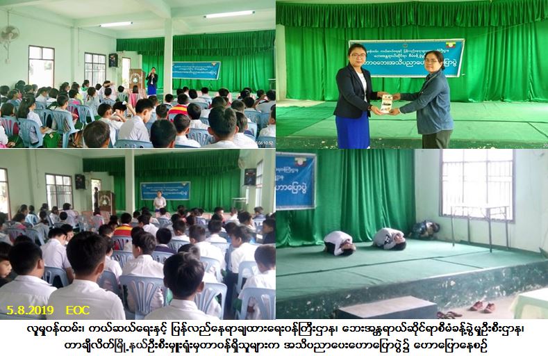 လူမှုဝန်ထမ်း၊ ကယ်ဆယ်ရေးနှင့် ပြန်လည်နေရာချထားရေးဝန်ကြီးဌာန၊ ဘေးအန္တရာယ်ဆိုင်ရာစီမံခန့်ခွဲမှုဦးစီး ဌာန၊ တာချီလိတ်မြို့နယ်ဦးစီးမှူးရုံးမှတာဝန်ရှိသူများသည် (၆-၈-၂၀၁၉) ရက်နေ့၊ နံနက်(၁၀း၀၀) မှ (၁၂း၀၀) အချိန်အထိ တာချီလိတ်မြို့၊ တာလော့ရပ်ကွက်၊ အခြေခံပညာအလယ်တန်းကျောင်း၌ အသိပညာပေး ဟောပြောပွဲကျင်းပပြုလုပ်ခဲ့ရာ ကျောင်းသား/ကျောင်းသူစုစုပေါင်း (၁၀၀) ဦး တက်ရောက်ခဲ့ပါသည်။ အဆိုပါဟောပြောပွဲ၌ ရာသီဥတုပြောင်းလဲခြင်းနှင့် စပ်လျဉ်း၍ ဖြစ်ပွားတတ်သော ဘေးအန္တရာယ်များ၊ ဘေးအန္တရာယ်မဖြစ်ပွားမီ/ ဖြစ်ပွားနေစဉ်/ ဖြစ်ပွားပြီးနောက် ဆောင်ရန်/ရှောင်ရန်အချက်များ ဆွေးနွေး ဟောပြောခြင်း၊ ငလျင်လှုပ်ခတ်နေစဉ်နေထိုင်ရမည့် အနေအထားကို လက်တွေ့သရုပ်ပြသခြင်း၊ ဘေးအမျိုးအစားအလိုက် တုန့်ပြန်ဆောင်ရွက်ရမည့် အနေအထားများကို ဂိမ်းများကစားခြင်းဖြင့် ရှင်းလင်းဟောပြောခဲ့ခြင်းတို့ဆောင်ရွက်ခဲ့ပြီး တက်ရောက်လာသူများအား လက်ကမ်းစာစောင်များဖြန့်ဝေခဲ့ပါ ကြာင်း သတင်းရရှိပါသည်။