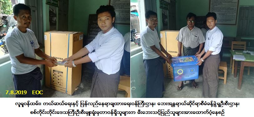 လူမှုဝန်ထမ်း၊ ကယ်ဆယ်ရေးနှင့် ပြန်လည်နေရာချထားရေးဝန်ကြီးဌာန၊ ဘေးအန္တရာယ်ဆိုင်ရာစီမံခန့်ခွဲမှုဦးစီး ဌာန၊ စစ်ကိုင်းတိုင်းဒေသကြီးဦးစီးမှူးရုံးမှတာဝန်ရှိသူများသည် မုံရွာခရိုင်၊ မုံရွာမြို့နယ်၊ လယ်တီရပ်ကွက်၊ နယ်မြေ (၂)၊ သပြေပင်တောရလမ်း၌ (၆-၈-၂၀၁၉) ရက်နေ့တွင် ဖြစ်ပွားခဲ့သော မီးလောင်မှုကြောင့် နေအိမ် (၁) လုံးရှိ အိမ်ထောင်စု(၁) စုမှ လူဦးရေ (၅) ဦးဘေးသင့်ခဲ့ရာ အဆိုပါဘေးသင့်ပြည်သူများအတွက် ဆန်ရိက္ခာဖိုးထောက်ပံ့ငွေ (၁၀,၅၀၀/-) ကျပ်၊ အိမ်ဆောက်ပစ္စည်းဖိုးထောက်ပံ့ငွေ (၁၀၀,၀၀၀/-) ကျပ်၊ ကယ်ဆယ်ရေးပစ္စည်း (၁၆) မျိုး အိမ်ထောင်စု(၁)စုစာတို့ကို (၇-၈-၂၀၁၉) ရက်နေ့တွင် ဘေးသင့်ပြည်သူများ ထံသို့ သွားရောက်ထောက်ပံ့ပေးအပ်ခဲ့ပါကြောင်း သတင်းရရှိပါသည်။