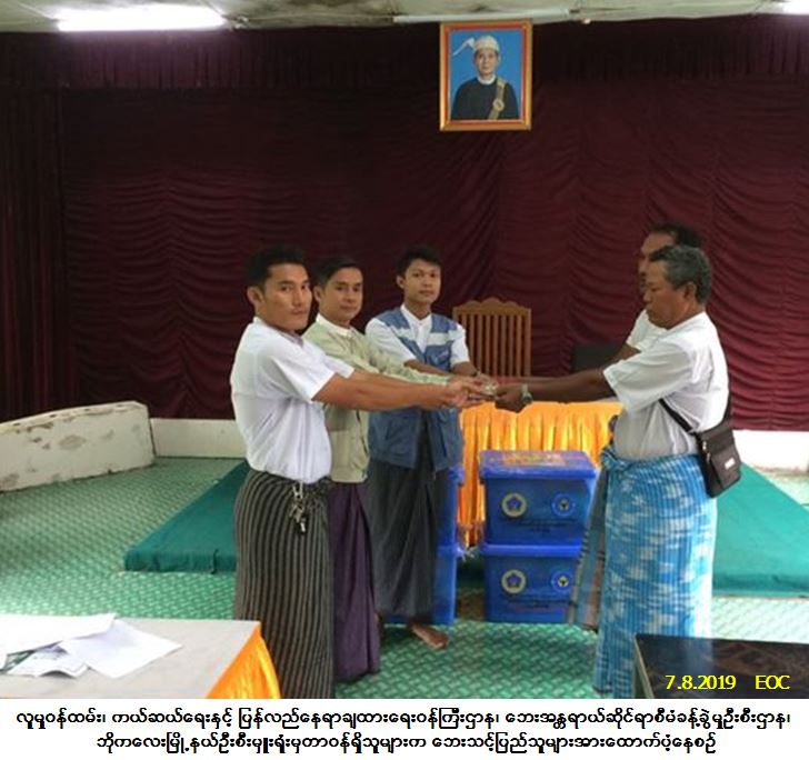 လူမှုဝန်ထမ်း၊ ကယ်ဆယ်ရေးနှင့် ပြန်လည်နေရာချထားရေးဝန်ကြီးဌာန၊ ဘေးအန္တရာယ်ဆိုင်ရာစီမံခန့်ခွဲမှုဦးစီး ဌာန၊ ဘိုကလေးမြို့နယ်ဦးစီးမှူးရုံးမှတာဝန်ရှိသူများသည် ဘိုကလေးမြို့နယ်၊ ပေါင်းတည်ကျေးရွာအုပ်စု၊ ဂွေးကုန်းကျေးရွာ၌ (၅-၈-၂၀၁၉) ရက်နေ့တွင်ဖြစ်ပွားခဲ့သော လေဘေးကြောင့် ပြိုကျပျက်စီး(ဓနိမိုး၊ ဓနိကာ) နေအိမ် (၁) လုံးအတွက် အိမ်ဆောက်ပစ္စည်းဖိုးထောက်ပံ့ငွေ (၁၀၀၀၀၀/-) ကျပ်၊ ဘေးသင့်လူဦးရေ (၄) ဦးအတွက် ဆန်ရိက္ခာ (၇) ရက်စာဖိုးထောက်ပံ့ငွေ (၈၄၀၀/-) ကျပ်၊ ကယ်ဆယ်ရေးပစ္စည်း (၁၇)မျိုး (၁) အိမ်ထောင်စုစာတို့ကို (၇-၈-၂၀၁၉) ရက်နေ့၊ (၁၁း၁၀) အချိန်တွင် ဘိုကလေးအထွေထွေအုပ်ချုပ်ရေးဦးဌာနမှတာဝန်ရှိသူများ၊ လွှတ်တော်ကိုယ်စားလှယ်များရှေ့မှောက်၌ ဘေးသင့် ပြည်သူများထံသို့ ထောက်ပံ့ပေးအပ်ခဲ့ပါကြောင်း သတင်းရရှိပါသည်။