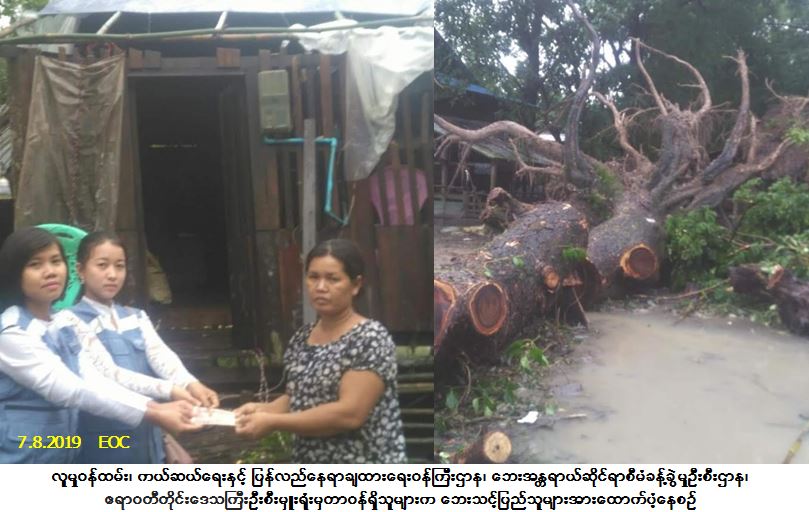 လူမှုဝန်ထမ်း၊ ကယ်ဆယ်ရေးနှင့် ပြန်လည်နေရာချထားရေးဝန်ကြီးဌာန၊ ဘေးအန္တရာယ်ဆိုင်ရာစီမံခန့်ခွဲမှုဦးစီး ဌာန၊ ဧရာဝတီတိုင်းဒေသကြီးဦးစီးမှူးရုံးမှတာဝန်ရှိသူများသည် ပုသိမ်ခရိုင်၊ ပုသိမ်မြို့၊ အမှတ်(၈)ရပ်ကွက်၊ ဘိုကြီးကုန်း၌ (၆-၈-၂၀၁၉) ရက်နေ့တွင် ဖြစ်ပွားခဲ့သောလေဘေးကြောင့် သစ်ပင်ပြိုလဲ၍ တစ်စိတ်တစ်ပိုင်းပျက်စီးနေအိမ် (၁) လုံး၊ အိမ်ထောင်စု(၁)စုမှ လူဦးရေ (၃) ဦးဘေးသင့်ခဲ့ရာ အဆိုပါဘေးသင့်ပြည်သူများ အတွက် ဆန်ရိက္ခာ (၇) ရက်စာဖိုးထောက်ပံ့ငွေ (၆,၃၀၀/-) ကျပ်၊ အိမ်ဆောက်ပစ္စည်းဖိုးထောက်ပံ့ငွေ (၅၀,၀၀၀/-) ကျပ်တို့ကို (၇-၈-၂၁၀၉) ရက်နေ့ (၁၆း၀၀) အချိန်တွင် ဘေးသင့်ပြည်သူများလက်ဝယ်အရောက် ထောက်ပံ့ပေးအပ်ခဲ့ပါကြောင်း သတင်းရရှိပါသည်။