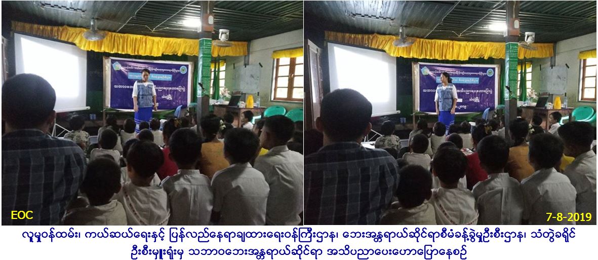 လူမှုဝန်ထမ်း၊ ကယ်ဆယ်ရေးနှင့်ပြန်လည်နေရာချထားရေးဝန်ကြီးဌာန၊ ဘေးအန္တရာယ်ဆိုင်ရာစီမံခန့်ခွဲမှုဦးစီးဌာန၊ သံတွဲခရိုင်ဦးစီးမှူး ရုံးမှ တာဝန်ရှိသူများသည် (၇.၈.၂၀၁၉)ရက်နေ့၊ (၁၀:၀၀)နာရီအချိန်မှ (၁၁:၃၀)နာရီအချိန်အထိ သံတွဲခရိုင်၊ သံတွဲမြို့၊ အမက(၅) ငပလီ လမ်းကျောင်းတွင် ကျောင်းသူ/သားများ၊ ဆရာ၊ ဆရာမများစုစုပေါင်း (၆၀)ဦးတို့အား ရာသီဥတုပြောင်းလဲလာမှုငလျင်ဘေးအန္တရာယ်၊ လေဘေး၊ ရေဘေးဖြစ်ပွားမှု၊ မိုးကြိုးဘေးအန္တရာယ်နှင့် သဘာဝဘေးအန္တရာယ်များ မဖြစ်ပွားမီ၊ ဖြစ်ပွားနေစဉ်နှင့်ဖြစ်ပွားပြီးချိန်များတွင် ဆောင်ရန်/ ရှောင်ရန်အချက်များဆွေးနွေးဟောပြောခဲ့ပြီး လက်ကမ်းစာစောင်ဖြန့်ဝေခြင်းများဆောင်ရွက်ခဲ့ပါကြောင်း သတင်းရရှိပါသည်။